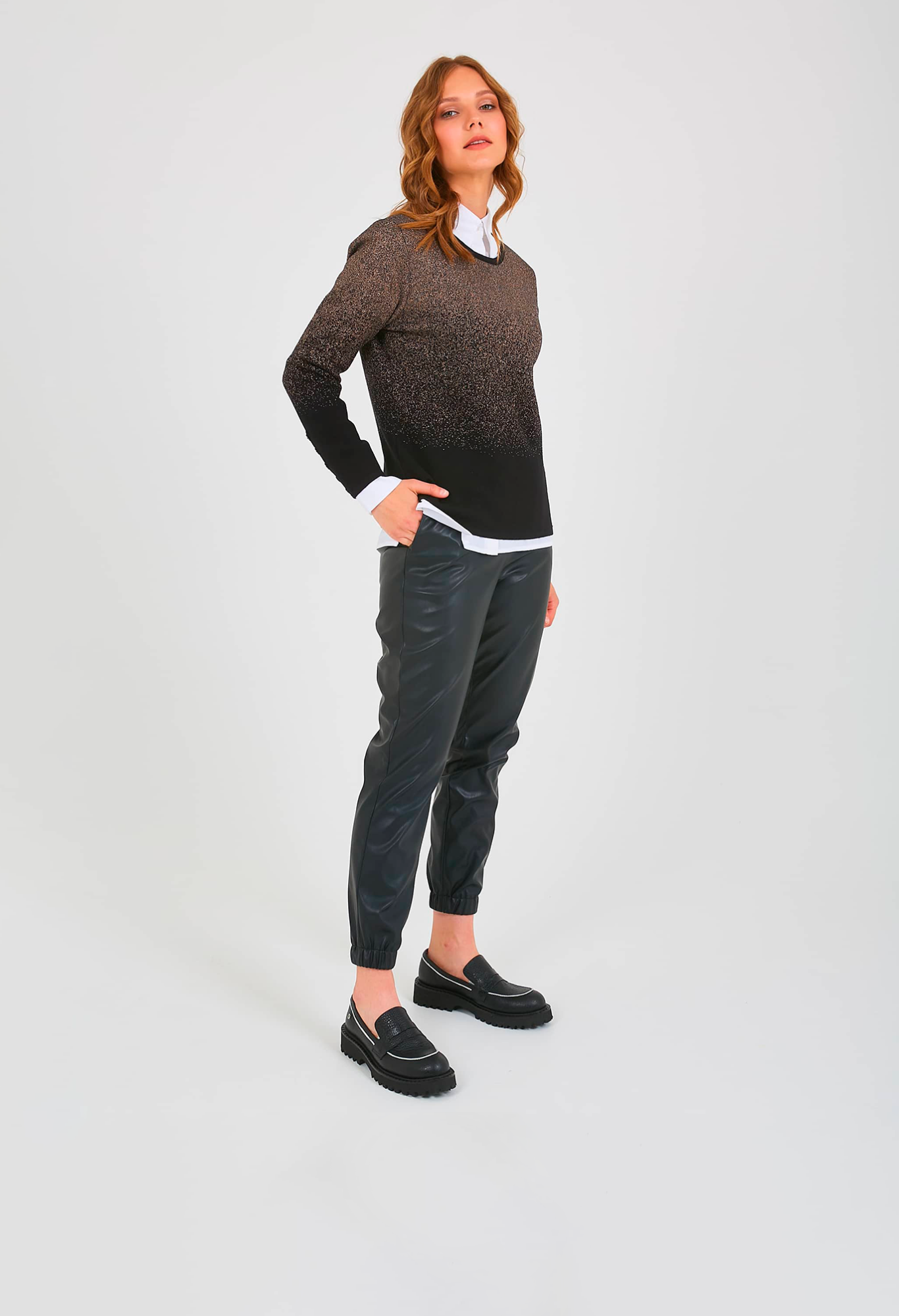 Джемпер средней длины прямого силуэта из легкого хлопка с добавлением акрила и люрекса, дизайнерская особенность модели – рисунок из нитей люрекса в виде градиента. Длинные втачные рукава с имитацией шлицы и 5 декоративными пуговицами. Круглый вырез горловины.