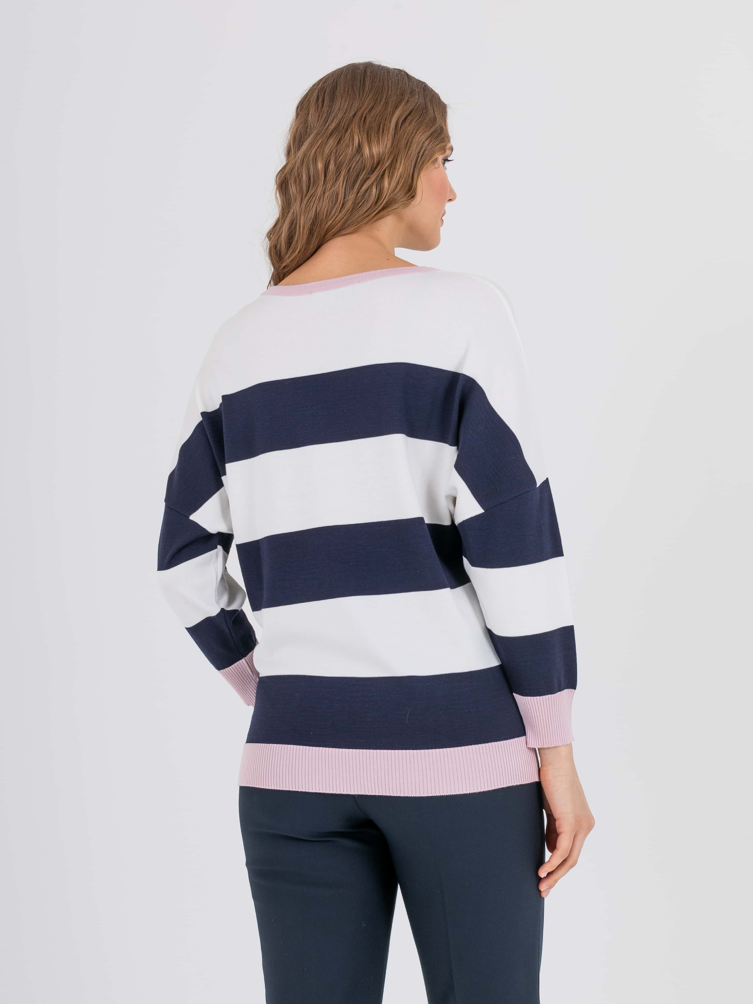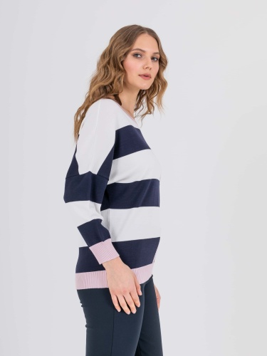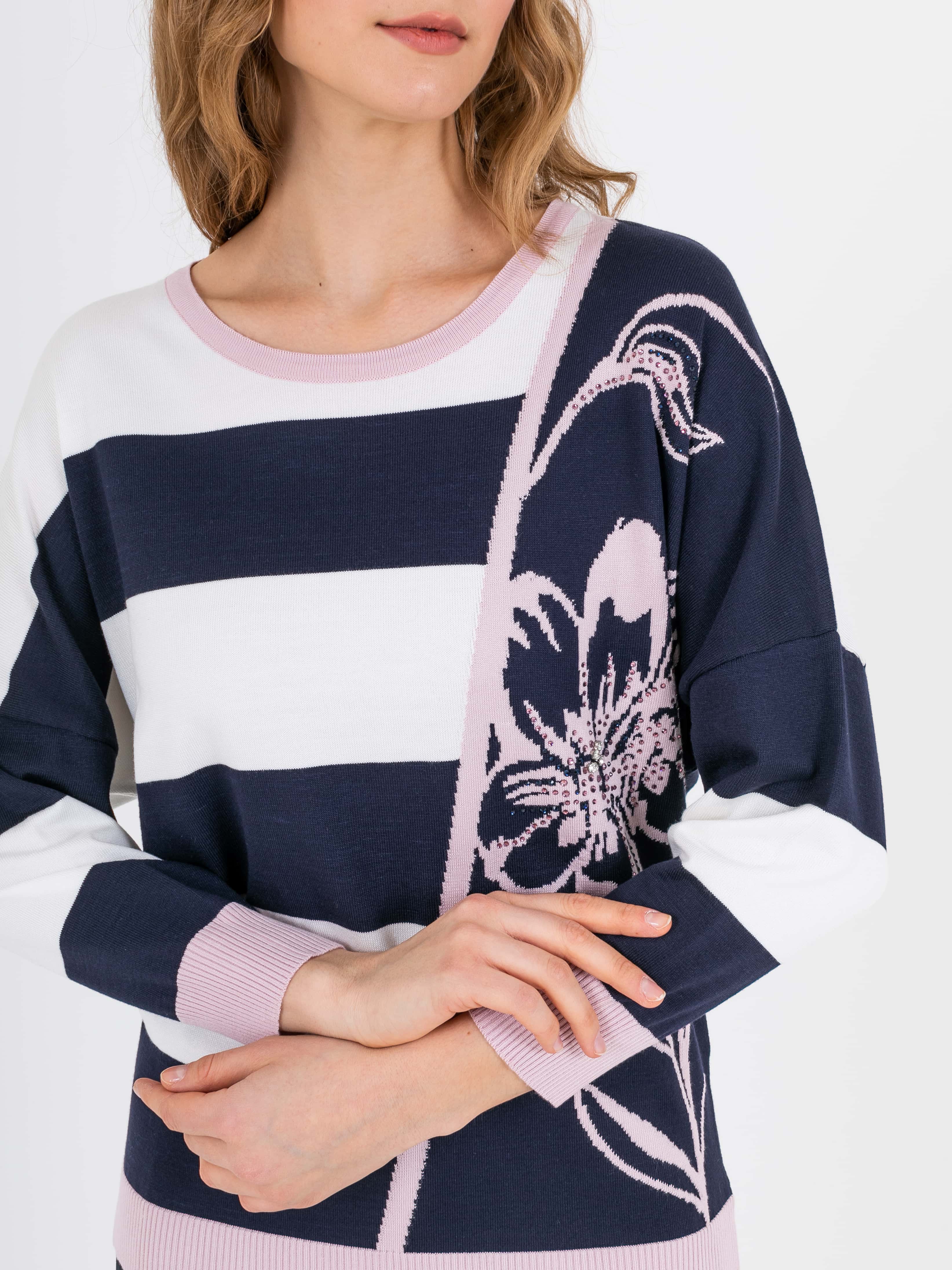 Джемпер средней длины прямого силуэта из мягкой вискозы с добавлением эластана, дизайнерская особенность модели – геометрический рисунок. Перед и спинка по низу обработаны манжетой. По переду выполнен нежный цветочный рисунок со стразами. Длинные втачные рукава со спущенной линией плеча и манжетами. Круглый вырез горловины.