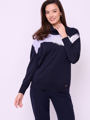 Трикотажная джемпер из смесовой вискозной пряжи с добавлением люрекса, с длинными рукавами, воротником-хомутом и стразами на груди. Длина по спинке: 62 см.