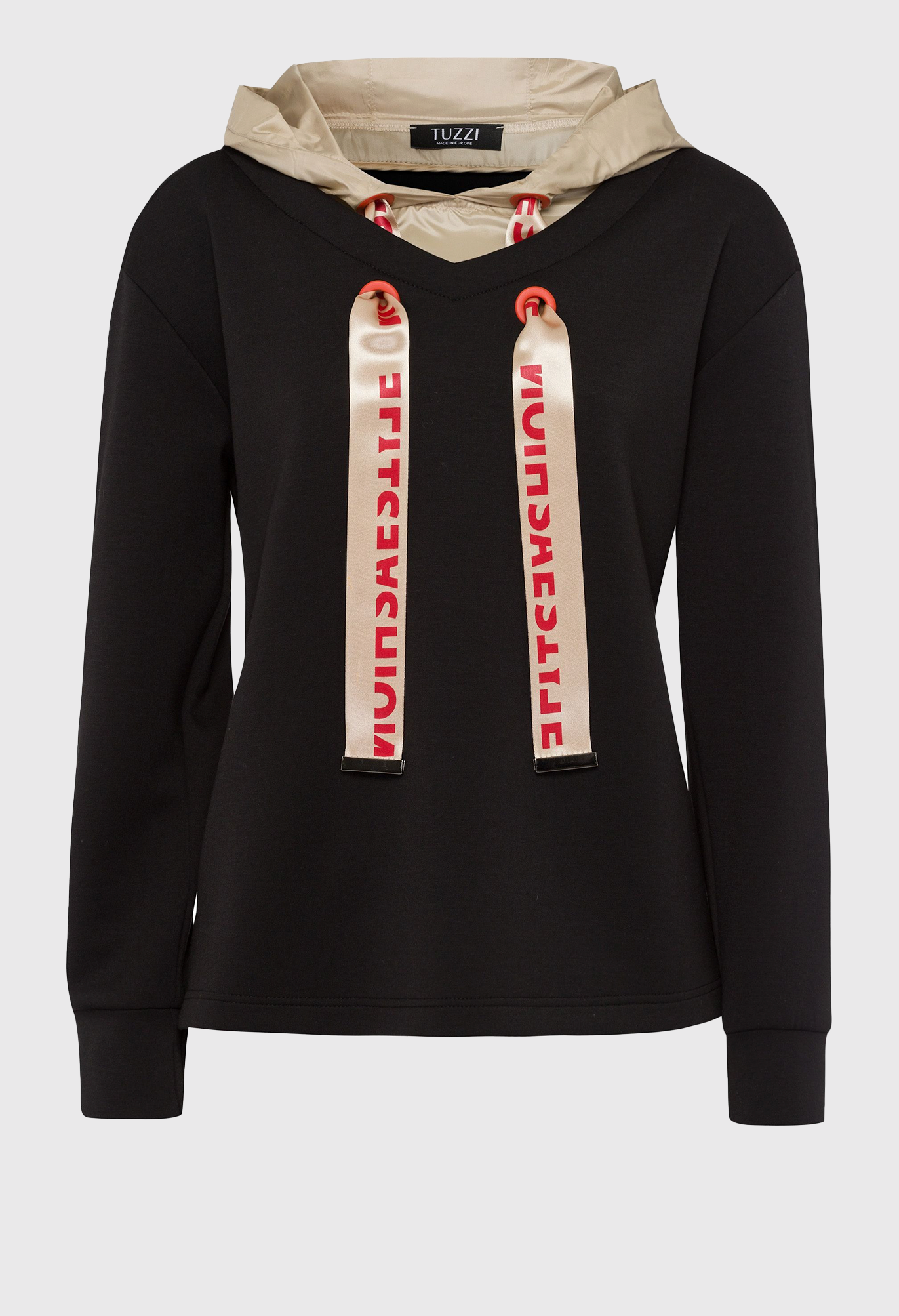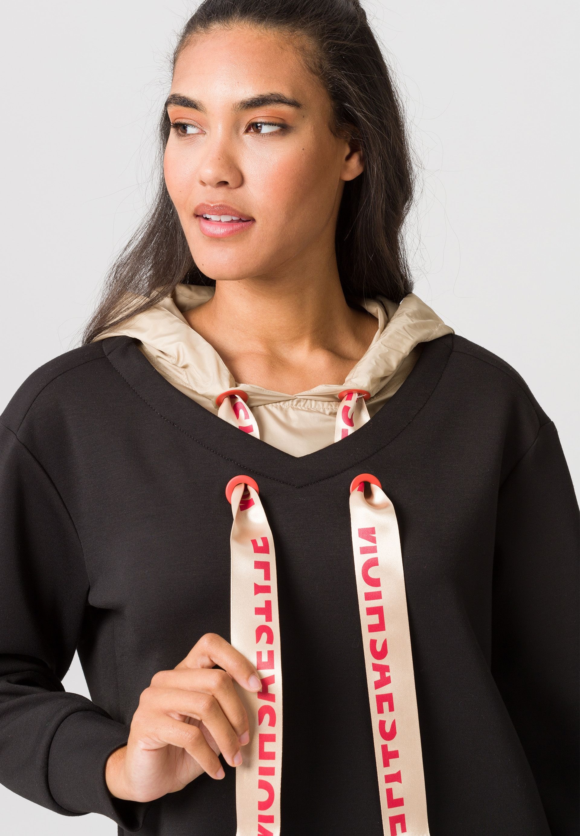 Женский пуловер с капюшоном и эффектной кулиской. Это отличная основа для ярких городских образов. Простой свитер из очень мягкого трикотажа имеет минималистичный дизайн, дополненный стильным капюшоном. Он выделяется, с одной стороны, матовой блестящей тканью, но, прежде всего, заметно широкими и классными бретелями на шнурке с принтом. Они продеваются через две пары петель соответствующего цвета. Эксклюзивный дизайн, непревзойденный комфорт в ношении – этот свитер просто незаменим!