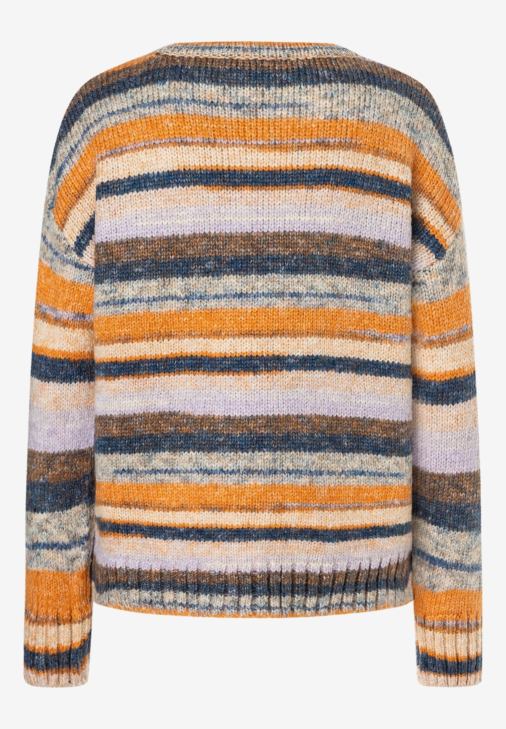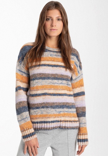 Пушистый, мягкий свитер с разноцветными полосками. Повседневный фасон со спущенными плечами, круглый вырез, длинный рукав. Ребристые манжеты на подоле и манжетах. Длина по размеру 42 - 58 см.