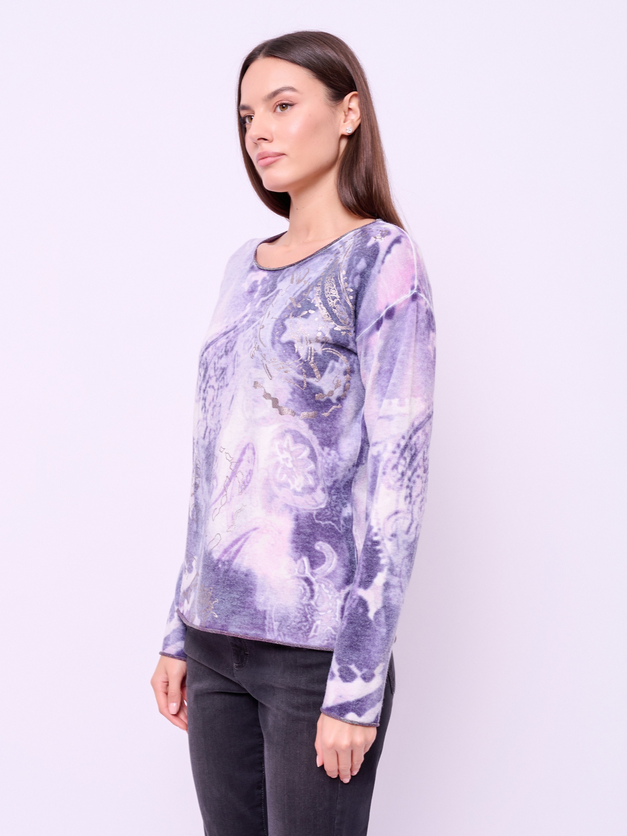 Детали: вырез горловины округлый, рукава длинные, покрой прямой, рисунок абстракция, серебристый принт. Длина по спинке: 58 см.