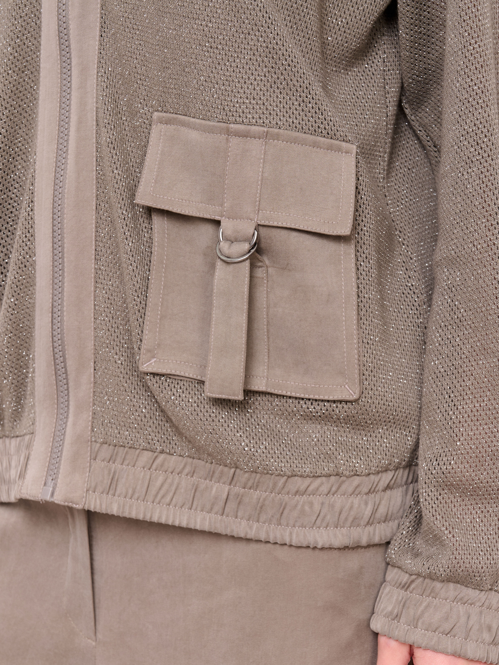 Детали: ажурный трикотаж, застежка молния, вырез горловины воротник-стойка, рукава-реглан длинные, карманы накладные, манжеты на резинке. Длина по спинке: 58 см.