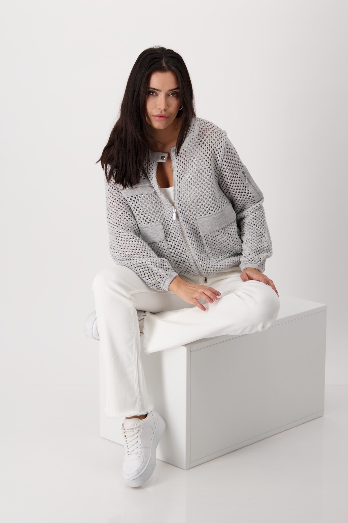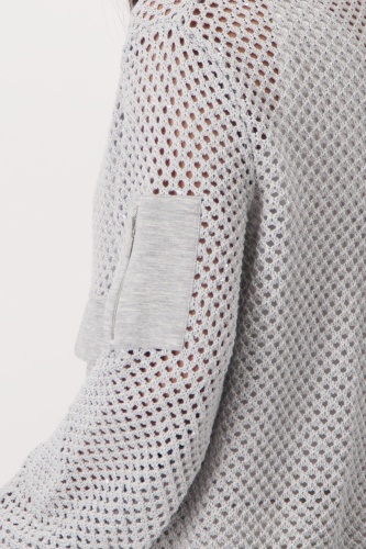 Современный кардиган из высококачественной смеси хлопка с блестящей люрексовой пряжей и ажурным узором. Регулярная посадка. Круглый вырез горловины с кнопкой. Длинный рукав. Ребристые манжеты и подол. Карман на молнии на левой руке. Ложный нагрудный карман на молнии. Двусторонняя молния. Длина 44 размера 52 см.