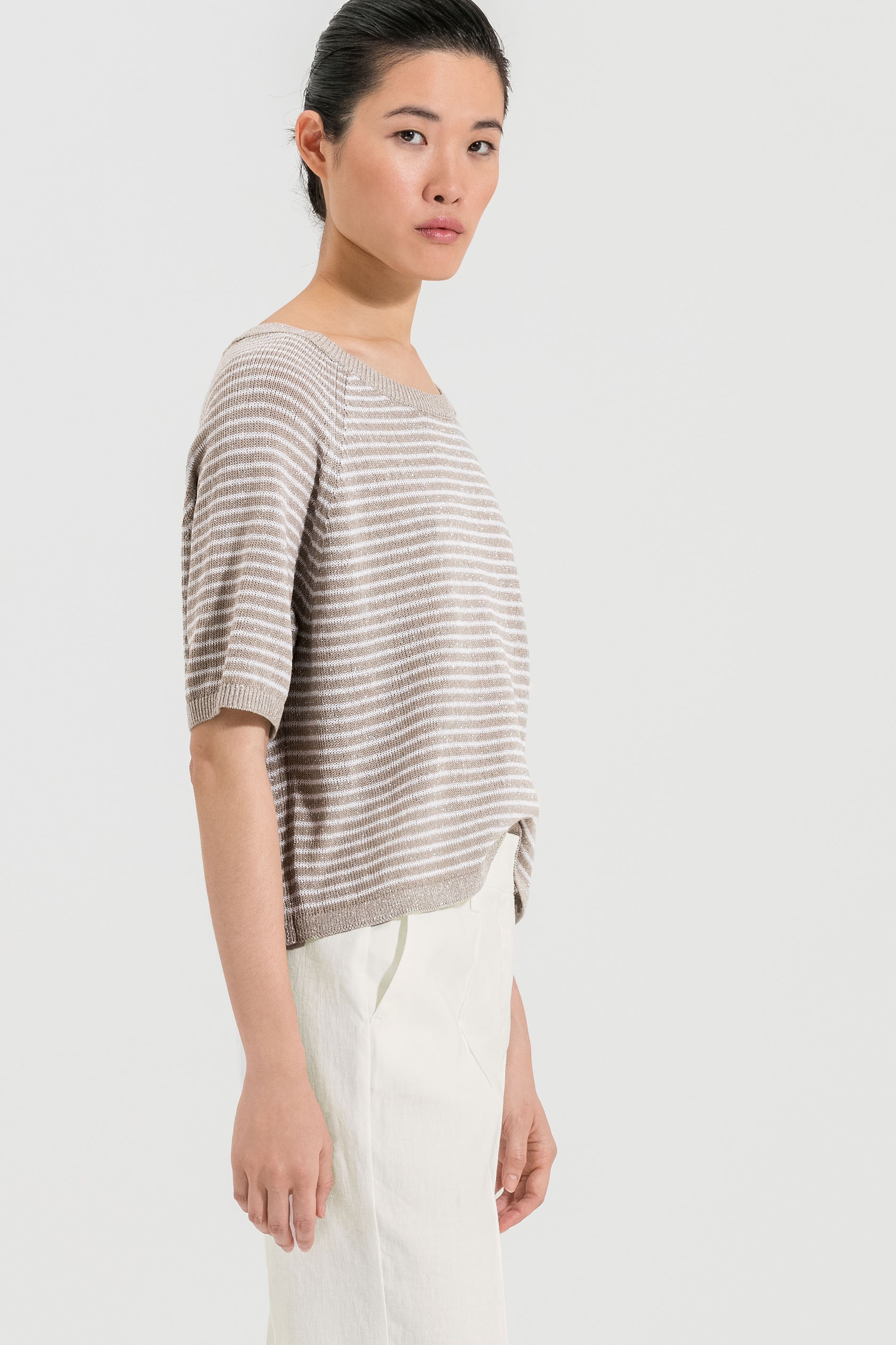 Hемецкий бренд. На сайте указаны Российские размеры. Полосатый джемпер из струящегося смесового хлопка с эффектными бликами из блестящей пряжи. Заниженная линия плеча и рукава реглан дополняют повседневный свободный стиль.