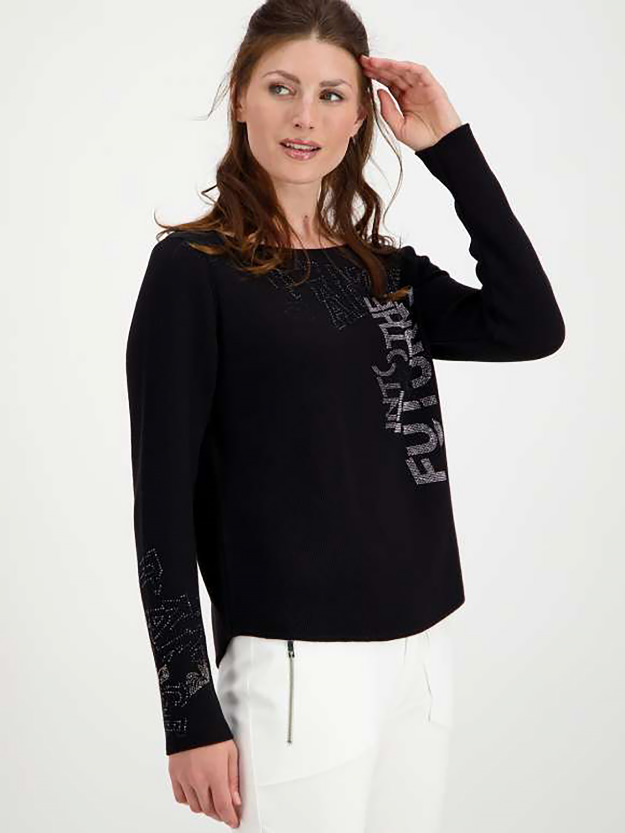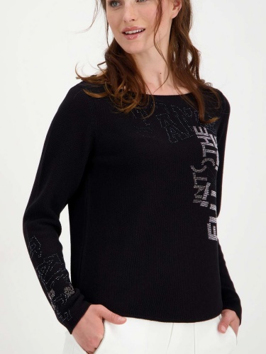 Однотонный джемпер свободного силуэта отлично скроет недостатки фигуры. Горловина-лодочка выгодно подчеркивает шею. Втачной рукав полной длины украшен стразами. Стразы также украшают перед изделия. Материал приятен в носке.