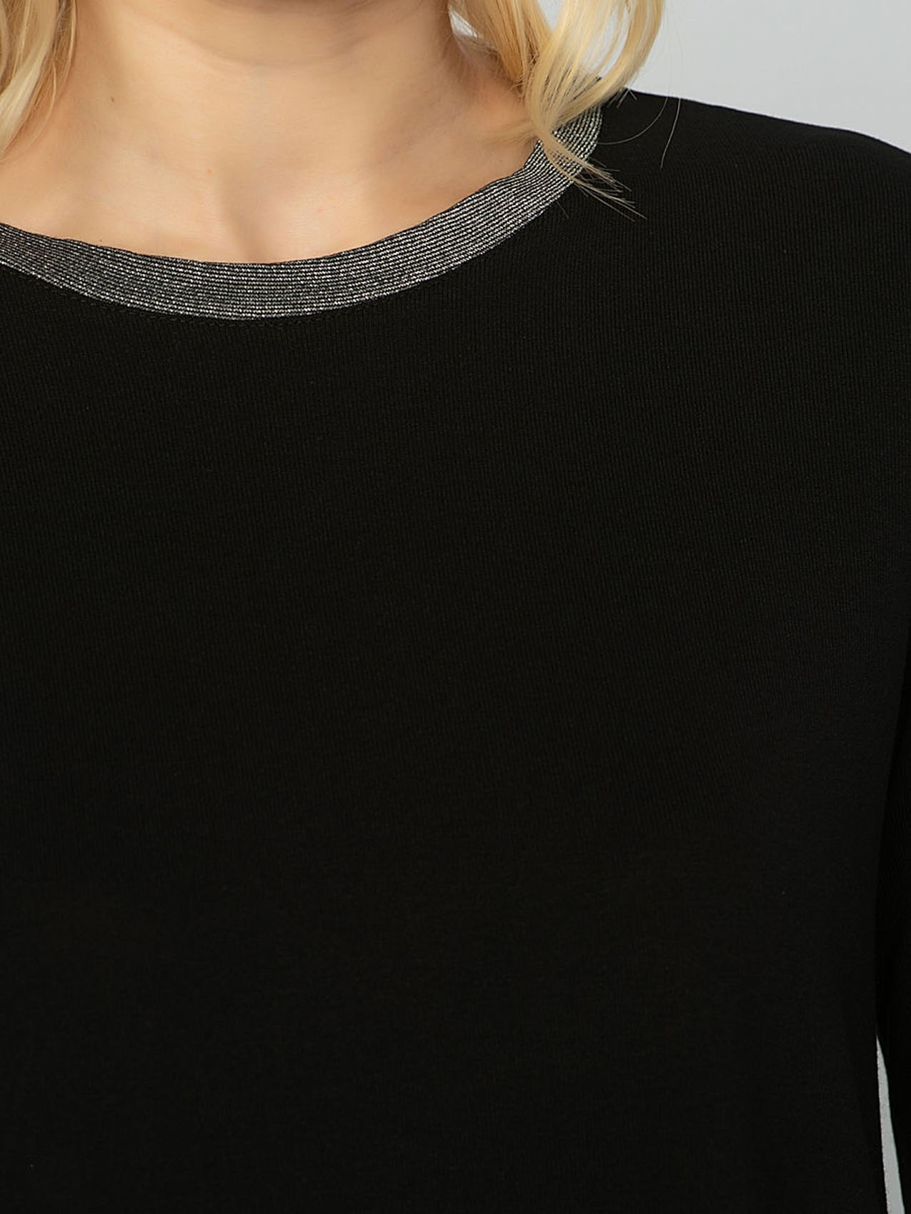 Джемпер прямого покроя. Удлиненная спинка, рукав 3/4 со спущенным плечом, разрезы по бокам. Контрастная отделка с вплетением нити люрекса. Материал из смеси вискозы с полиэстером и эластаном приятен к телу.