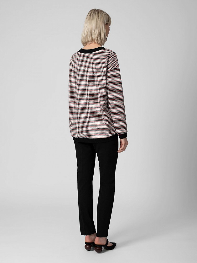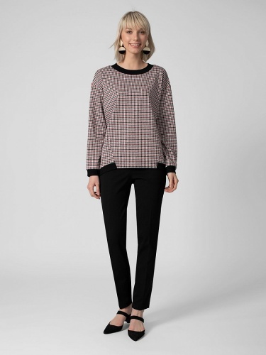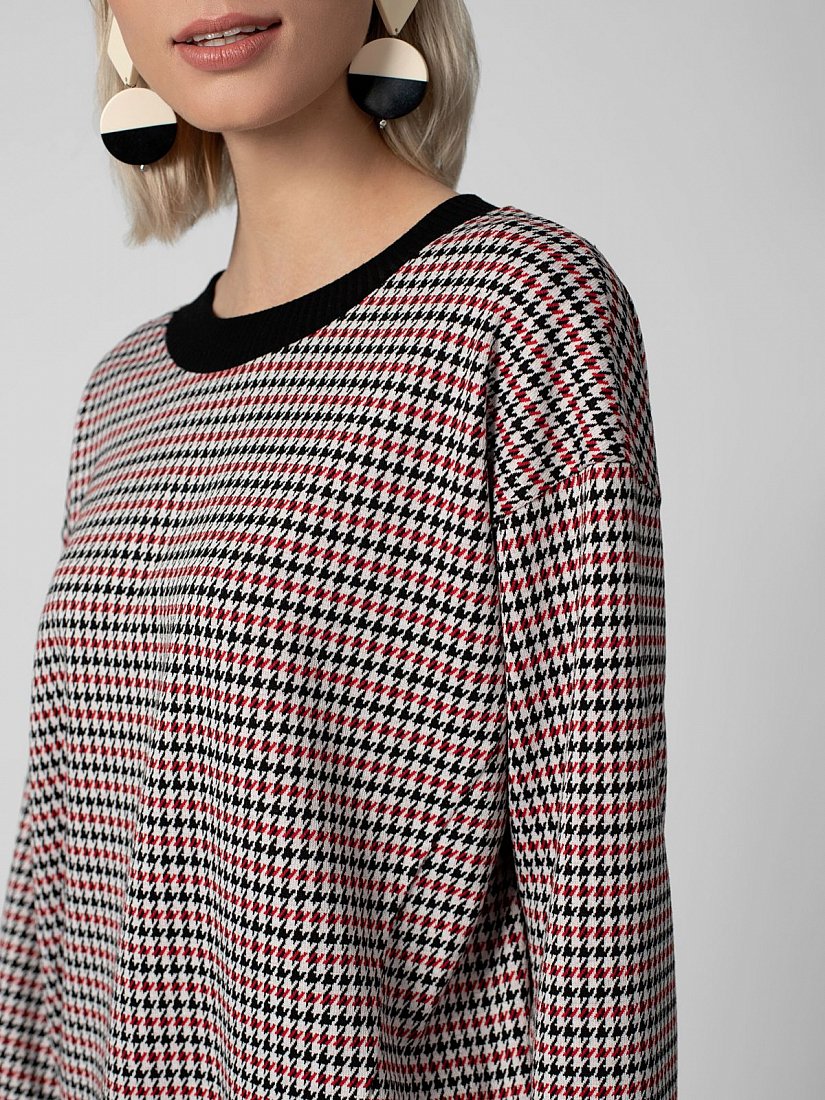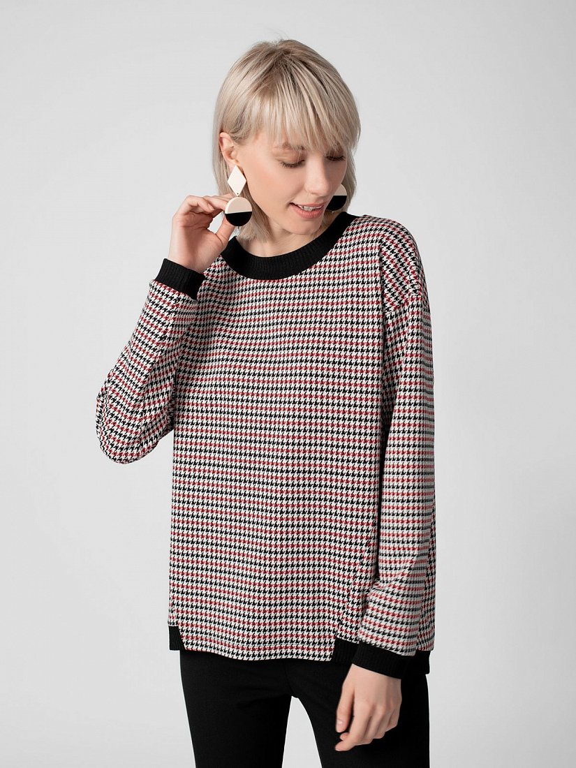 Джемпер из трикотажного полотна в клетку прямого силуэта с круглой горловиной и втачным рукавом полной длины. Спереди декоративные косые рельефы. По горловине и низу рукавов контрастная черная отделка из резинки.