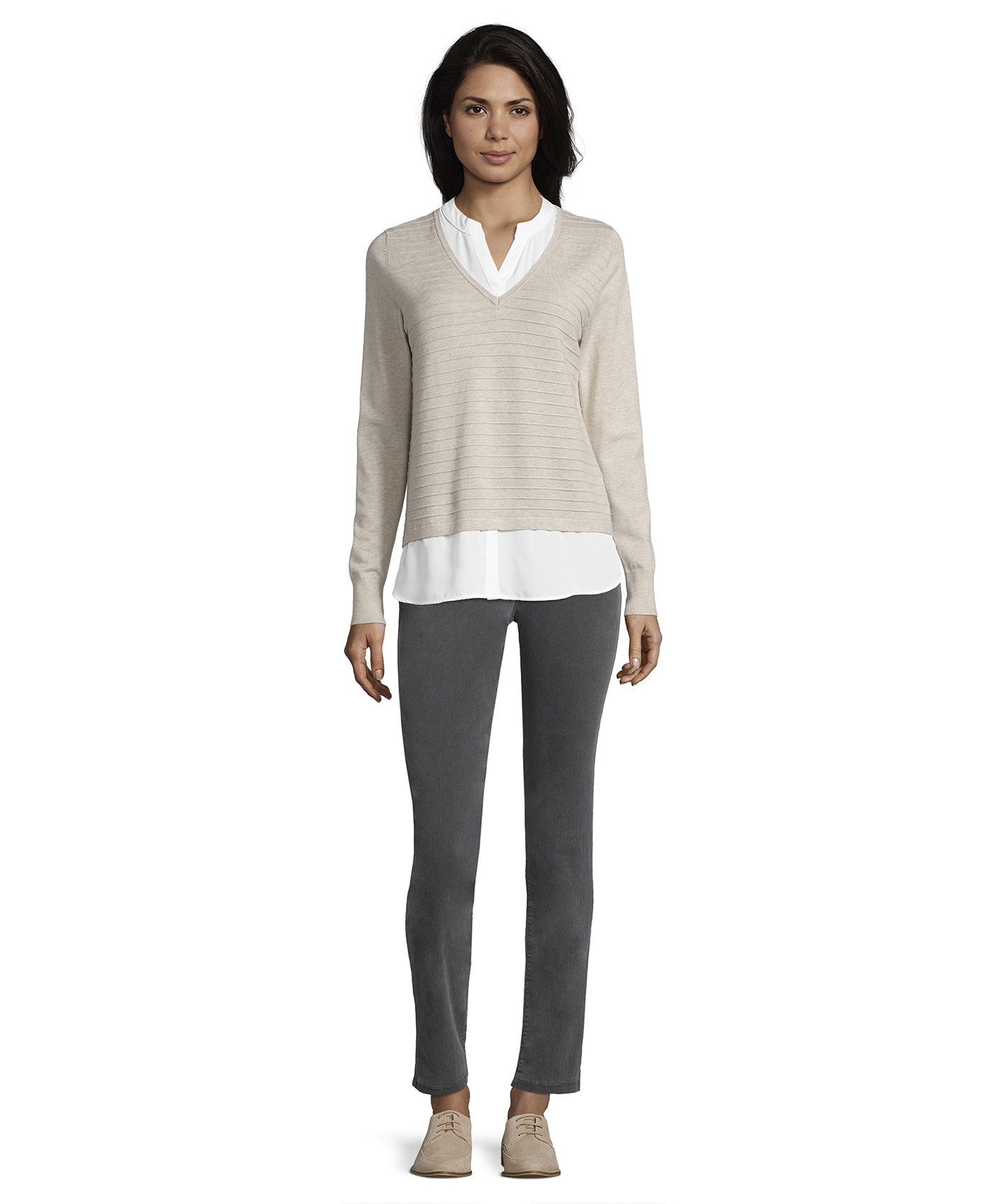 Джемпер с имитацией модели-двойки смотрится очень женственно и элегантно. Слегка прилегающий силуэт, V-образный вырез, длинные рукава. Материал из вискозной смеси приятен к телу и обеспечивает комфорт. В сочетании с брюками этот джемпер создает сдержанный образ в стиле смарт-кэжуал.