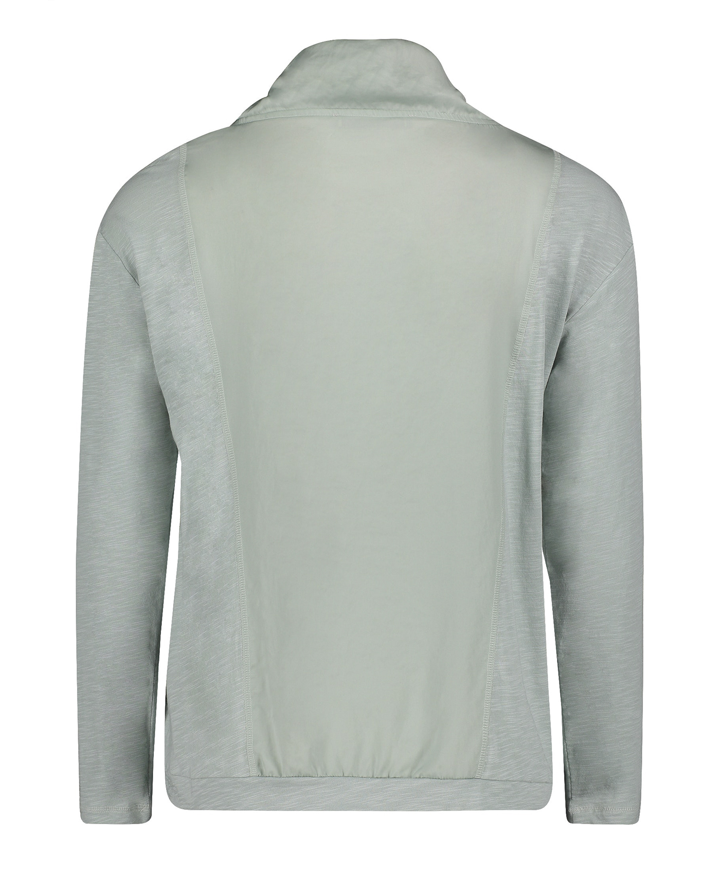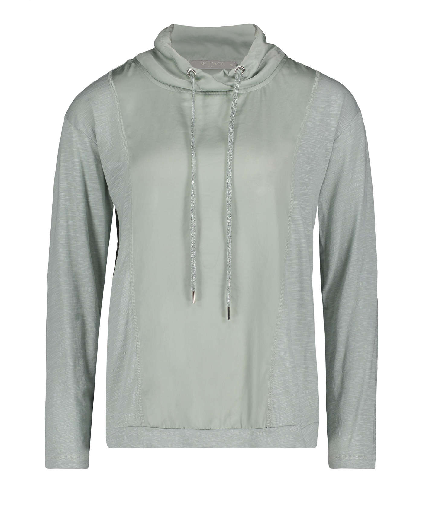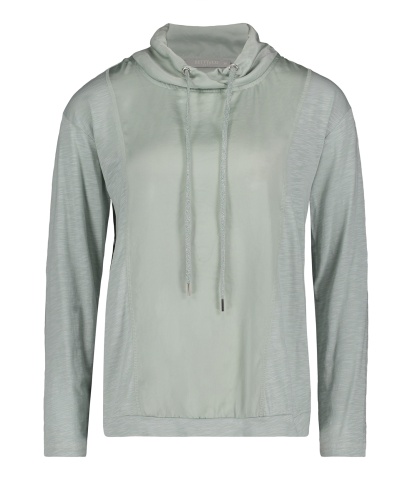 Джемпер прямого покроя. Длинные рукава, капюшон на кулиске. Сочетание приятных к телу материалов. Отличный вариант для прогулок и занятий спортом.