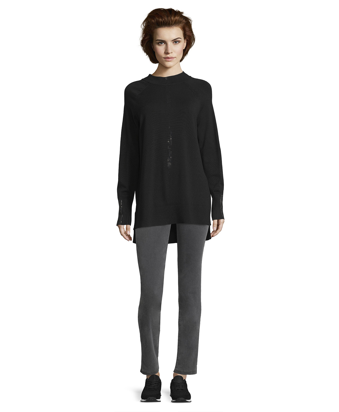 Этот джемпер смотрится одновременно непринужденно и элегантно. Слегка прилегающий силуэт, вырез горловины "воронка", длинные рукава реглан, удлиненная спинка изделия. Декор стразами на переде изделия и рукавах создает нарядный образ. Материал из вискозной смеси приятен к телу и обеспечивает комфорт. В сочетании с брюками этот джемпер создает стильный современный образ.