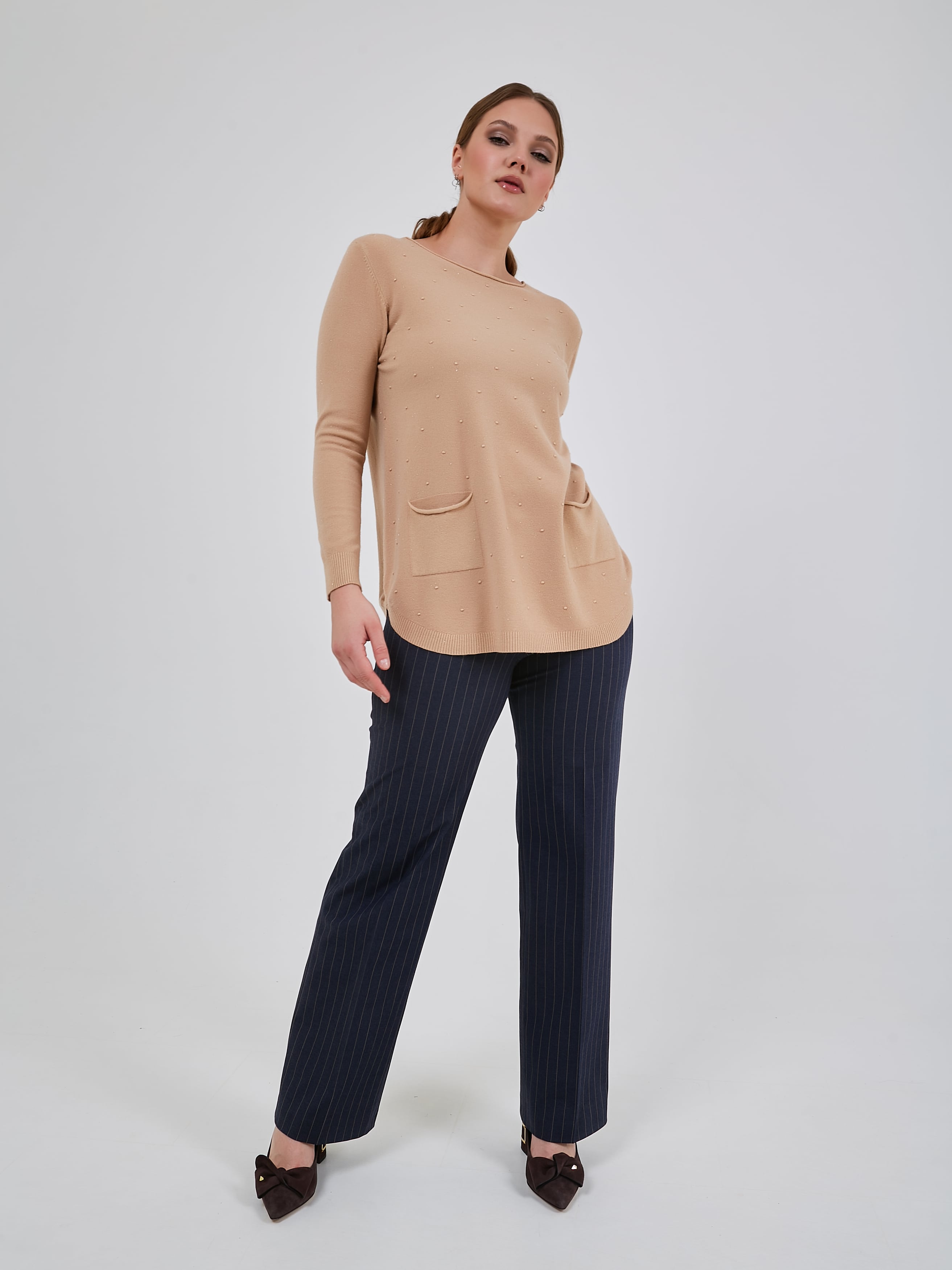 Удлинённый джемпер прямого кроя с небольшими карманами, круглой горловиной и резинками на манжетах.