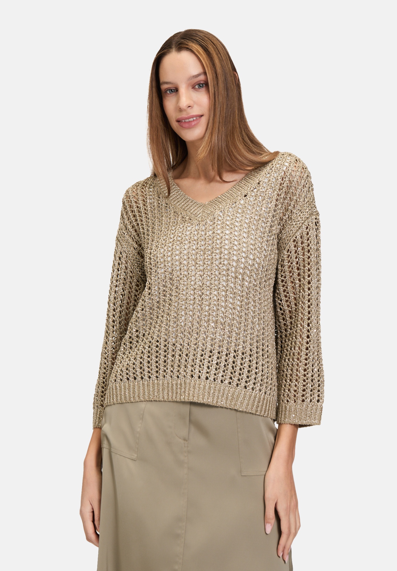 Этот ажурный свитер добавит элегантности вашему образу благодаря блестящим акцентам и непринужденному, простому крою. V-образный вырез и свободный крой создают современный, непринужденный образ, а укороченные рукава 3/4 обеспечивают дополнительный комфорт и непринужденный вид. Идеально подходит для модных повседневных образов с ноткой гламура!