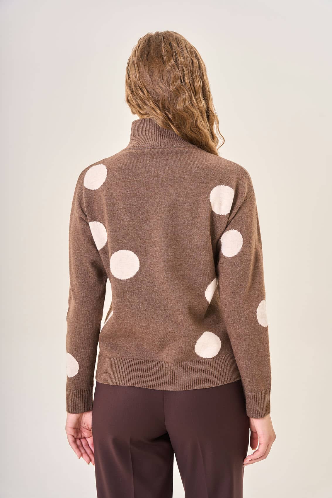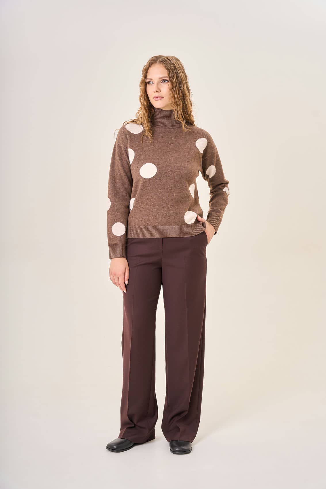 Женский свитер с высоким воротником и свободным кроем. Узоры в виде горошин равномерно распределены по всей поверхности свитера, придавая ему игривость и оригинальность. Материал высокого качества подчеркивает комфорт и удобство в повседневной носке. Осень-Зима'25/26. Капсула "Вино из одуванчиков"