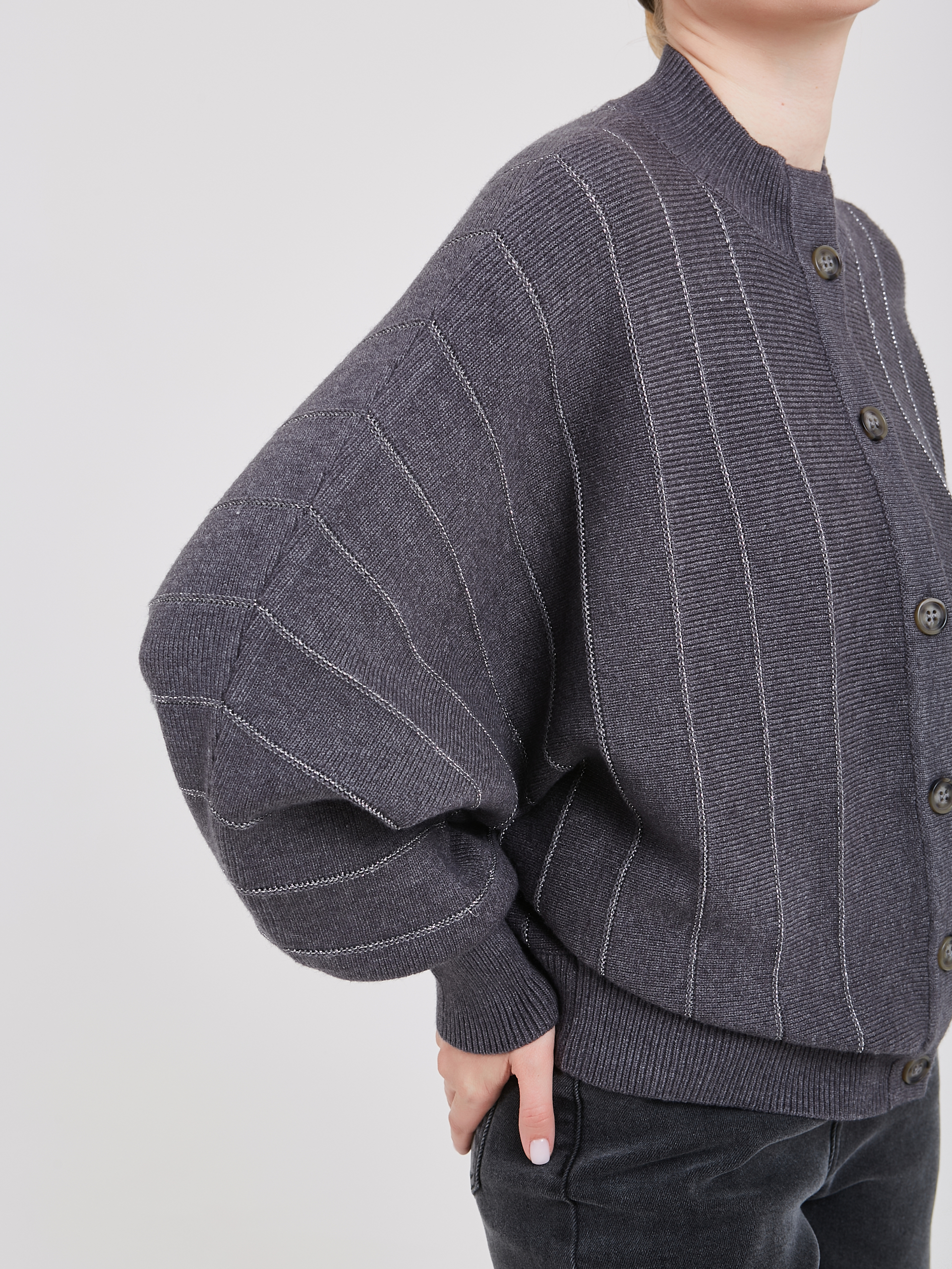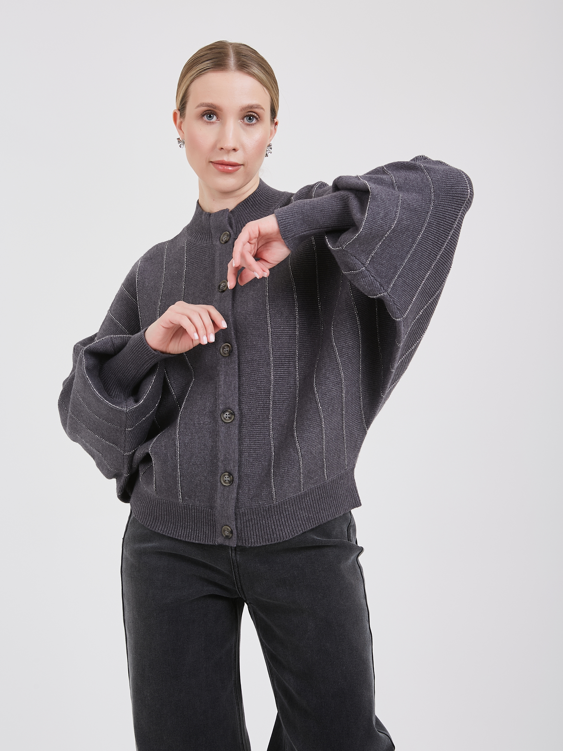 Серый кардиган с объемными рукавами и аккуратными вертикальными полосами придают изделию современный вид. Застежка на пуговицах позволяет регулировать степень открытости горловины, создавая индивидуальный стиль. Универсальность модели делает её отличным выбором для повседневных образов и прохладных вечеров.Осень-Зима'25/26. Капсула "Вишневый сад"