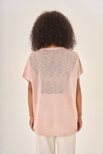 Свободная блузка пастельно-розового оттенка с коротким рукавом и круглым вырезом. Центральное внимание привлекает крупный прямоугольный принт на передней стороне — изящный рисунок слона, выполненный в стилистике классической гравюры. Изящный дизайн и приятный к телу материал делают эту блузку идеальным выбором для создания легкого и романтичного образа.