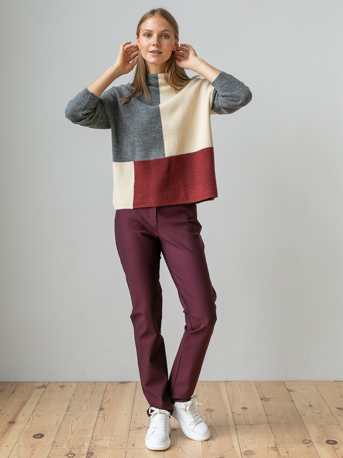 Оригинальный теплый джемпер в стиле колор-блок. Сочетание контрастных оттенков и геометрических форм создает яркий образ. Джемпер представлен в двух оттенках: красном и синем. Шерсть в составе делает материал приятным к телу. Прямой крой подходит любому типу фигуры.