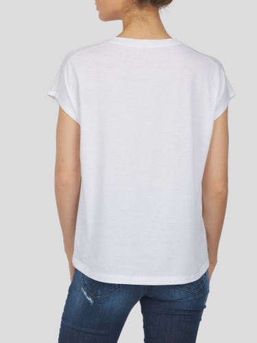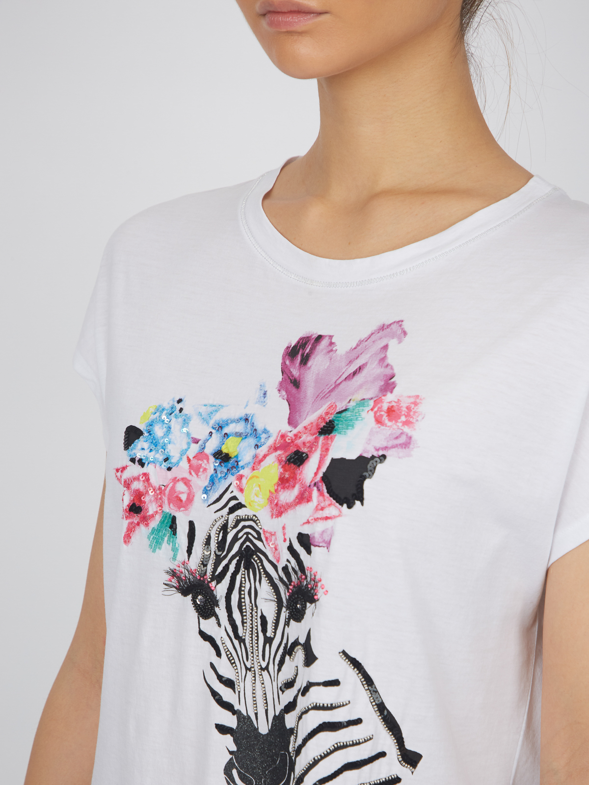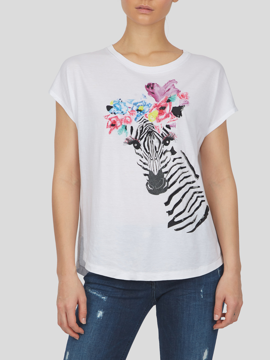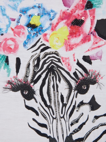 Белая футболка с оригинальным анималистичным принтом. Свободный силуэт, цельнокроеный короткий рукав. Материал из 100%-го хлопка приятен к телу и обеспечивает комфортное ношение.