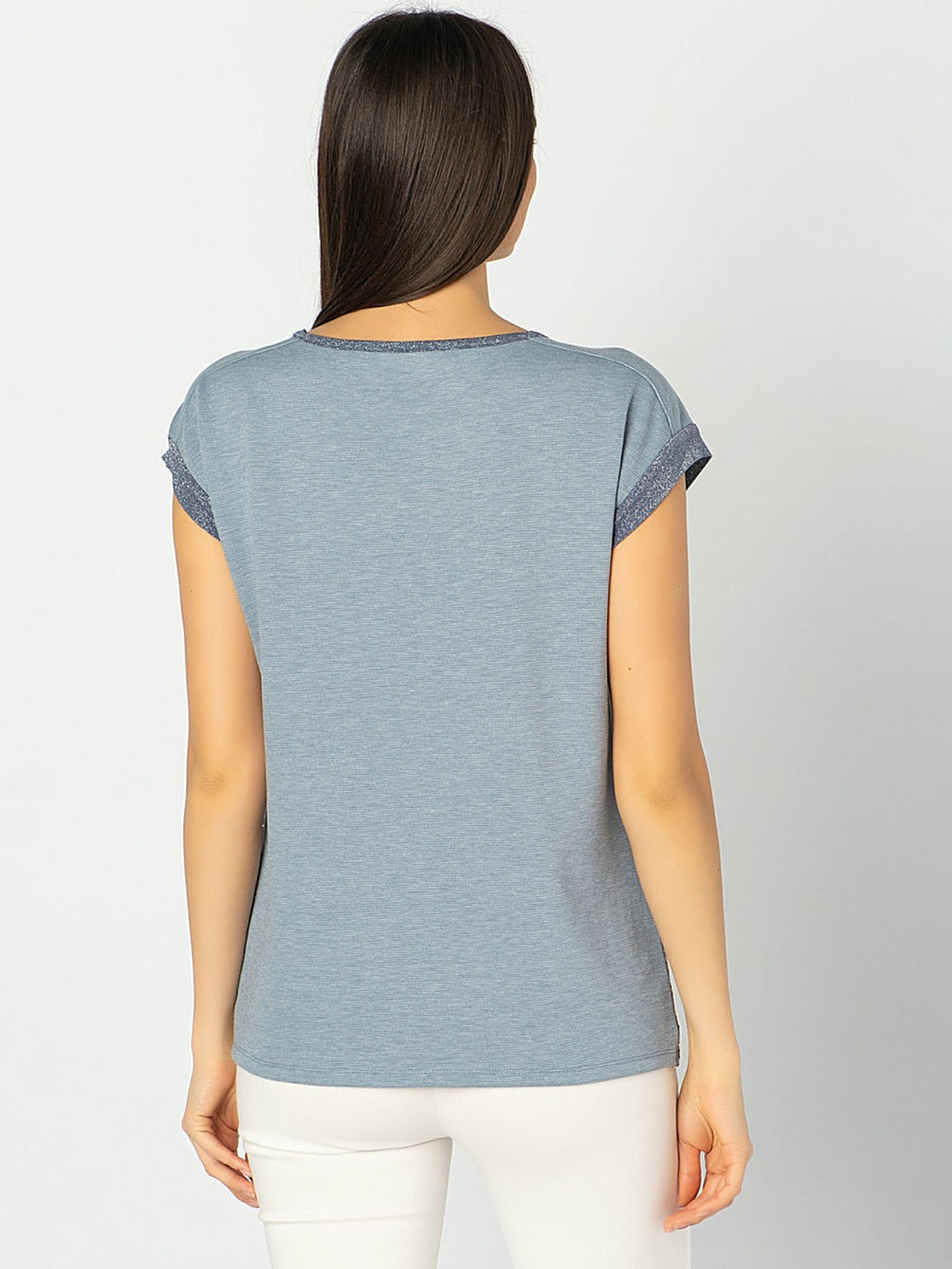 Футболка слегка приталенного силуэта. Декор пайетками по переду изделия, отделка с нитью люрекса. Короткий цельнокроеный рукав. Приятный к телу материал из смеси хлопка и эластана. Длина изделия по спинке: 65 см.