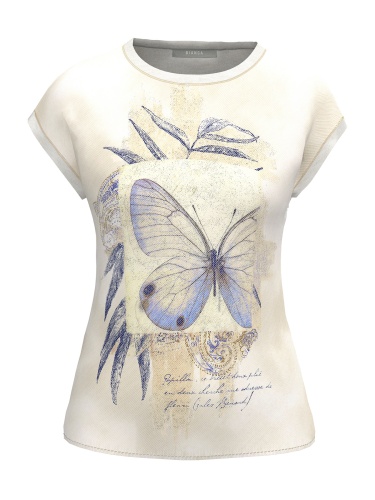 Футболка в нежном нюдовом оттенке с романтичным принтом спереди. Короткий цельнокроеный рукав с подворотом, круглый вырез горловины.