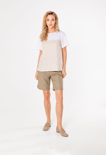 На сайте указаны российские размеры. Ткань: Легкая блузка из 100% льна. Лен – идеальный природный материал, который выбирают за приятные ощущения на теле, воздухопроницаемость и дорогую стильную фактуру. Крой: Свободная блузка с коротким рукавом – идеальная базовая модель, которая не сковывает движение и дарит максимальный комфорт. Круглый вырез добавляет элементов casual и спорт-шик, позволяя создавать сотни образов для повседневной жизни. Универсальность модели одинаково выигрышно смотрится на разных типах фигур, широкая линейка до 56 размера позволяет удовлетворить спрос женщин разной комплекции. Отделка: непревзойденный стиль блузки создает союз из двух сдержанных, но стильных оттенков, которые подчеркнут красоту женщин разных цветотипов. Комбинация цветных блоков или Color Block – нескучная классика, не выходящая из моды, но приковывающая сотни взглядов к удивительному контрасту на одежде.