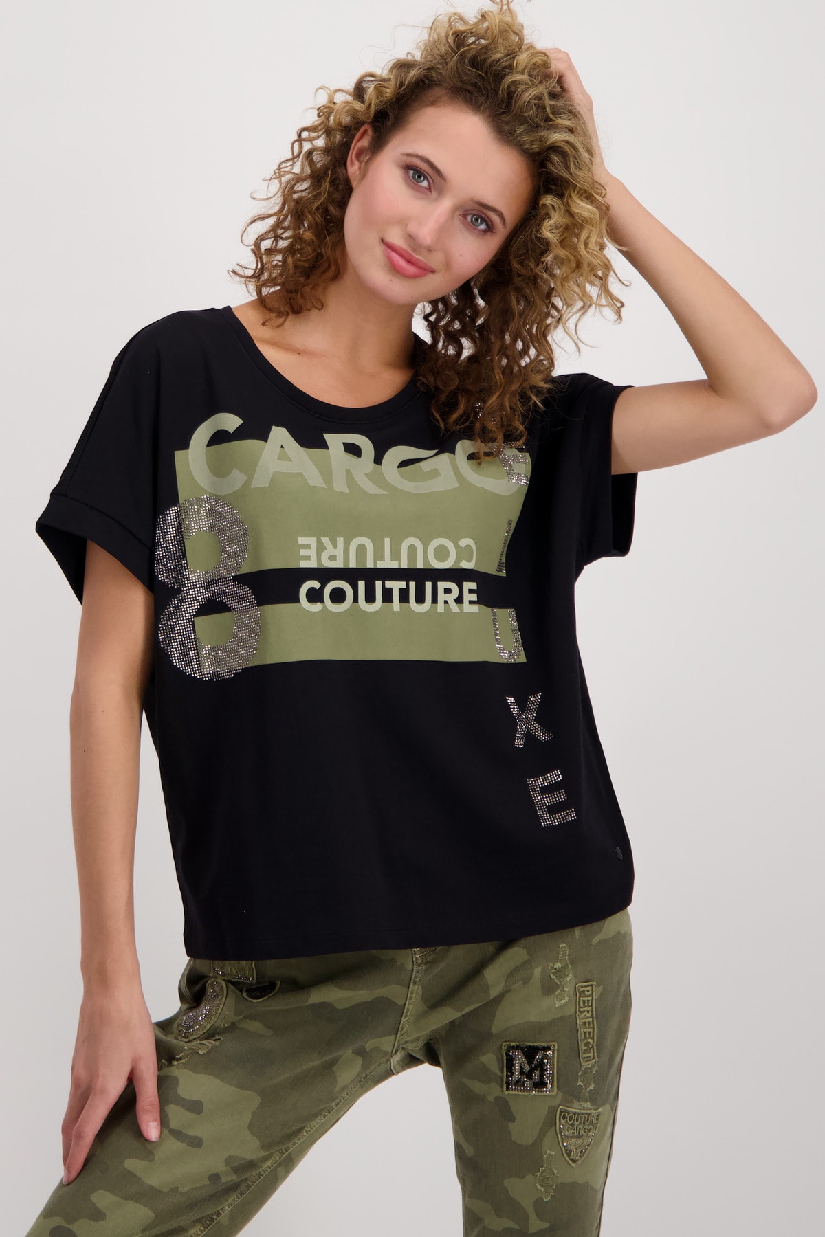 На сайте указаны российские размеры. Рубашка из джерси с половиной рукавов, круглым вырезом и принтом. Сочетание контрастных букв из сверкающих стразов, блесток и глянцевого лакированного принта в сочетании с двумя контрастными цветными принтами спереди делает рубашку из джерси monari вашим новым любимым компаньоном. Форма: прямой крой со вставкой и оверлочным швом в тон на круглом вырезе горловины и предполагаемым объемным коротким рукавом с манжетами на концах рукавов. Сочетание высококачественного хлопка и модала также гарантирует комфорт в течение всего дня. Модель ростом 176 см. Длина спины 44 размера составляет 62 см.