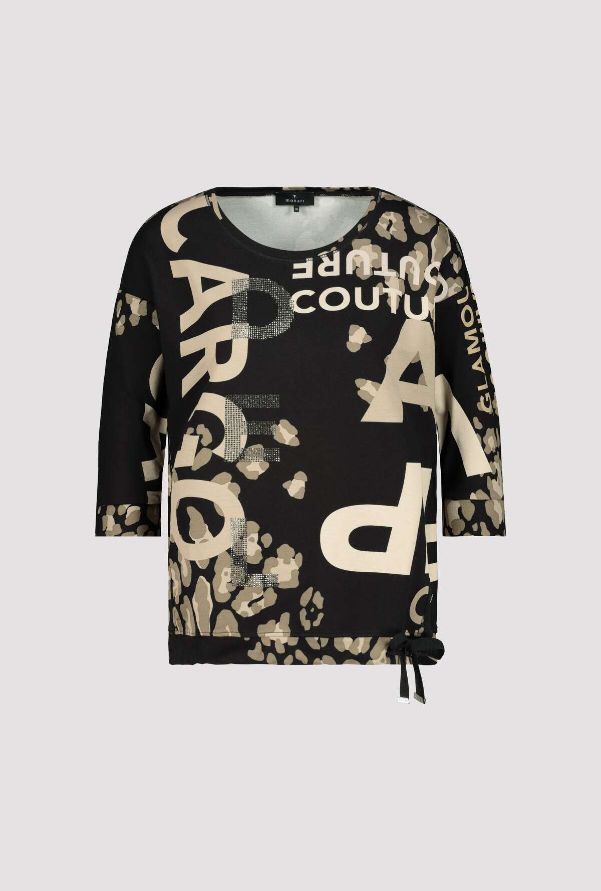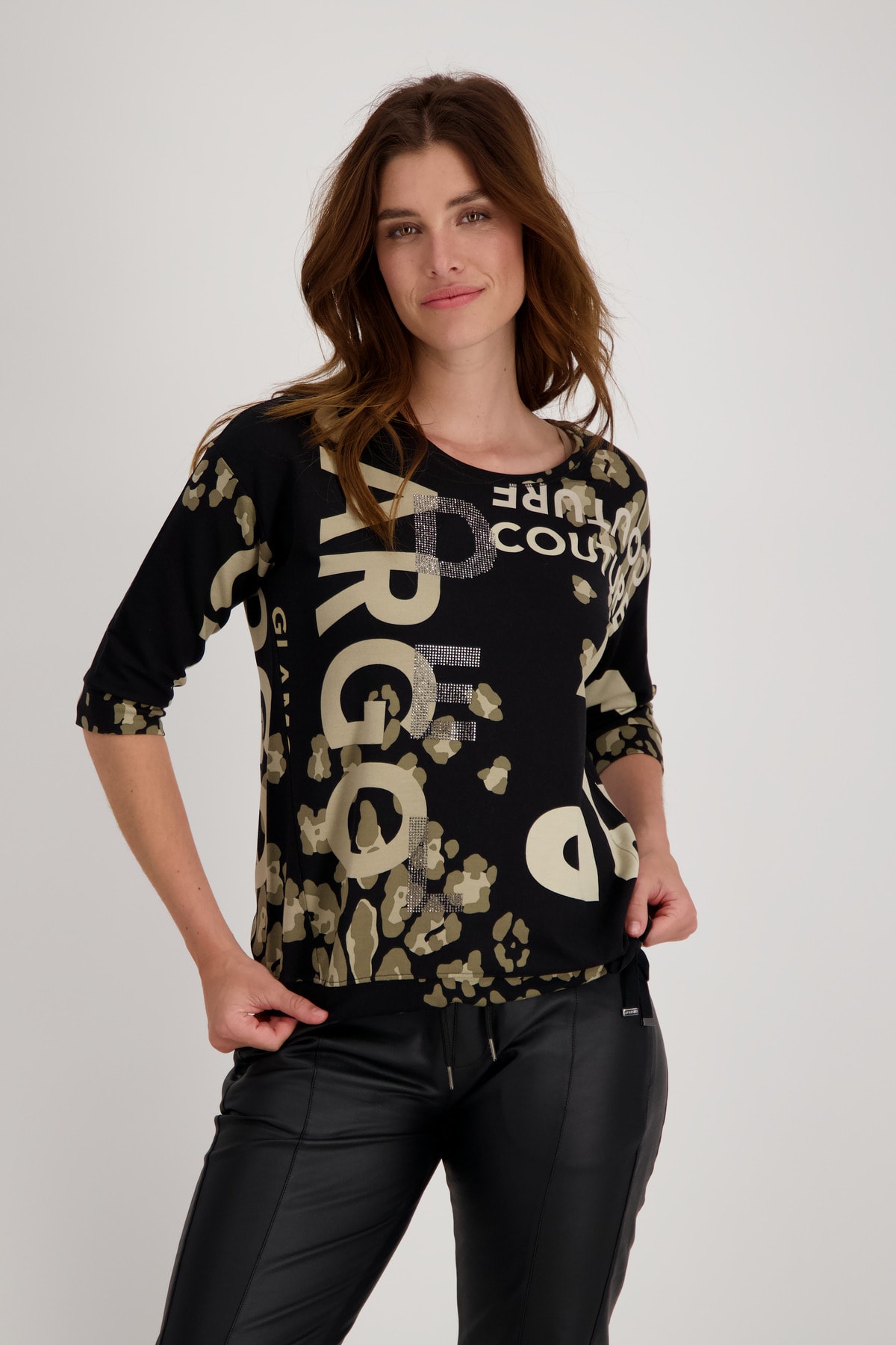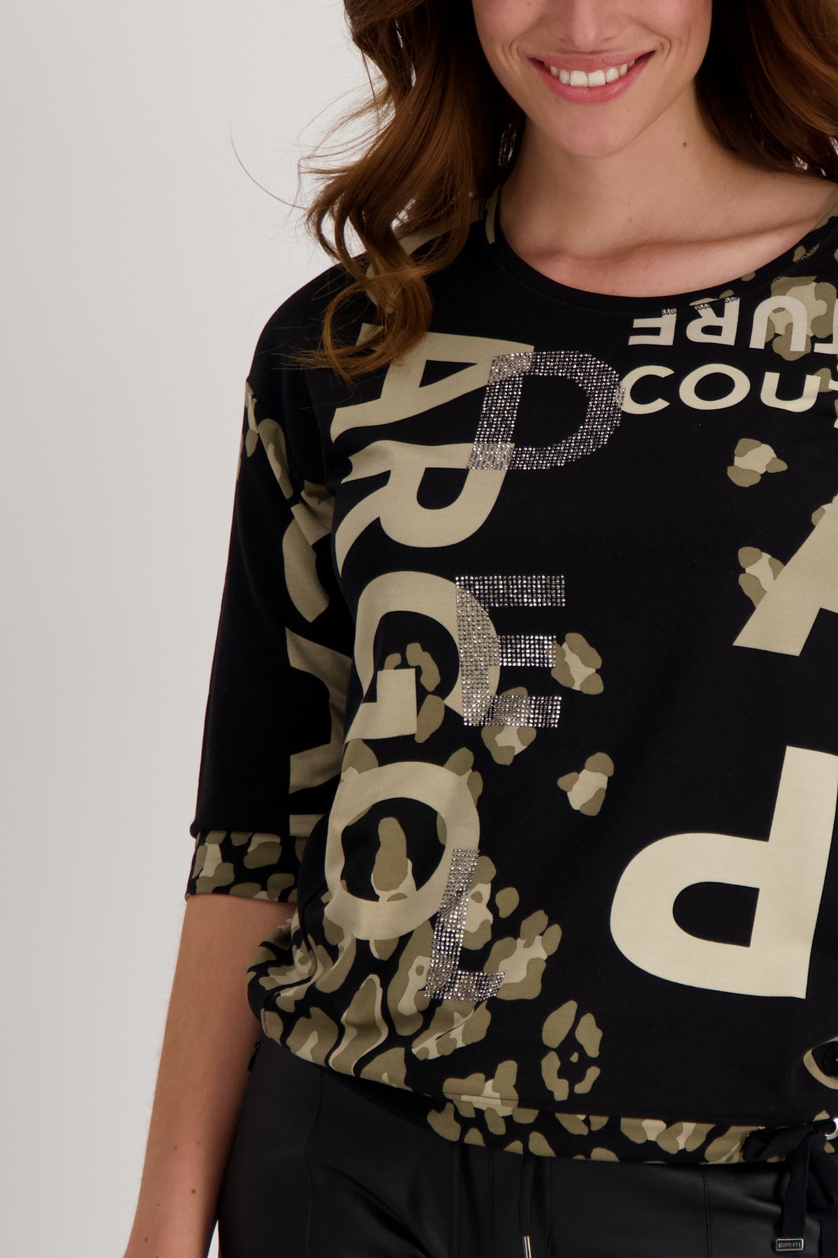 На сайте указаны российские размеры. Круглый вырез горловины со вставками, оверлочный шов с люрексом и необработанный край Рукава прямого кроя ¾ Обрезанные плечи с необработанным краем Надписи из пайеток и блестящий леопард спереди Сплошной принт с надписями Модель из струящейся смеси вискозы и модала с эластичной резинкой. Модель ростом 179 см. Длина спины 44 размера составляет 62 см.