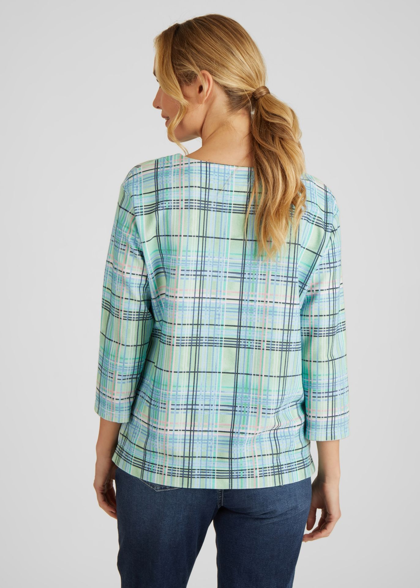 На сайте указаны российские размеры. Футболка в клетку с небольшим воротником-стойкой — must have в вашем гардеробе. Рукава 3/4 и прямой крой гарантируют удобную посадку. На сдержанном воротнике-стойке небрежная кордовая тесьма. Эту толстовку легко комбинировать с любимыми брюками. Длина по спинке от плеча для размера 46: 64 см. Рост модели 176 см.
