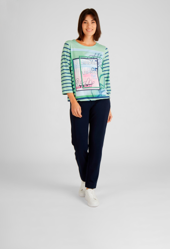 На сайте указаны российские размеры. Футболка с рукавом 3/4 выделяется экстравагантным принтом спереди. Полосатая рубашка прямого фасона с круглым вырезом имеет резинку по низу. Передний принт представляет собой образец интересно поставленной формулировки. Носите рубашку с джинсами или стильно с спортивными брюками. Длина по спинке от плеча для размера 46: 64 см. Рост модели 176 см.