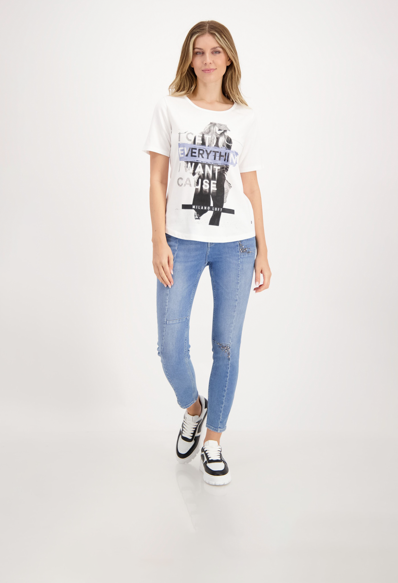 На сайте указаны российские размеры. Футболка с коротким рукавом с фотопринтом и стразами. Модель слегка приталена, имеет половинчатый рукав и круглый вырез горловины. В то время как фотопечать женщины украшена сверкающими стразами, надпись со сверкающими стразами придает женственной рубашке безошибочную изюминку. Смесь хлопка и модала гарантирует, что вы будете чувствовать себя абсолютно комфортно в этой белой рубашке с принтом. Чтобы сделать образ модным, советуем сочетать его со стильными джинсами облегающего кроя и украшениями. Длина по спинке 44 размера составляет 64 см. Модель ростом 178 см