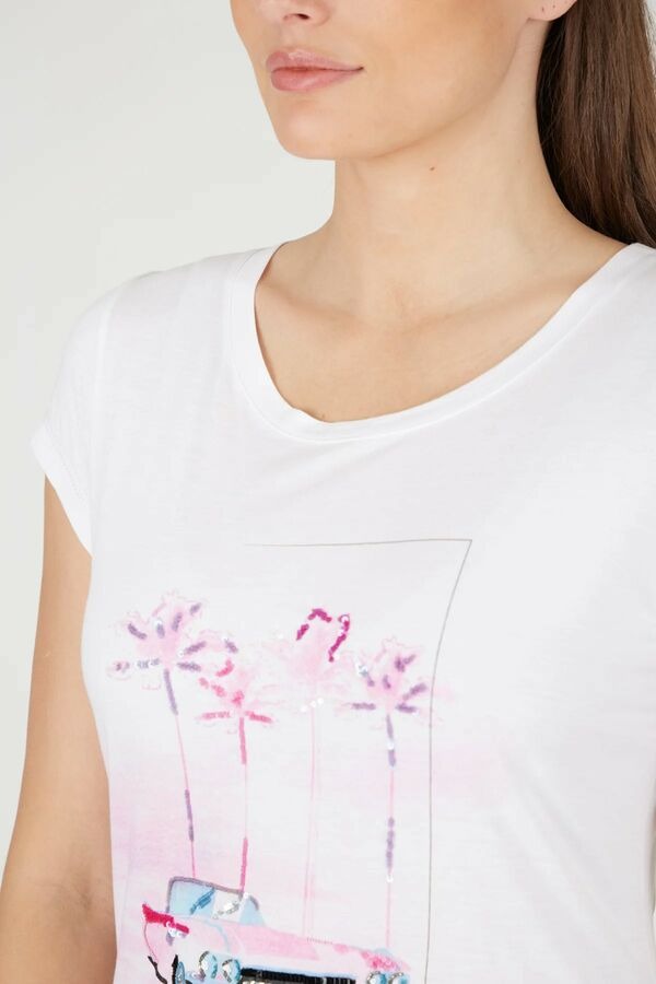 На сайте указаны Российские размеры. Классическая футболка с коротким рукавом и ипринтом с машиной и пальмами. Принт расшит различными бисером и пайетками.