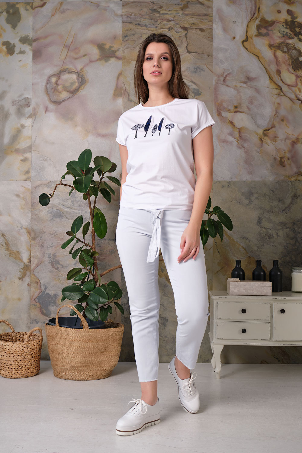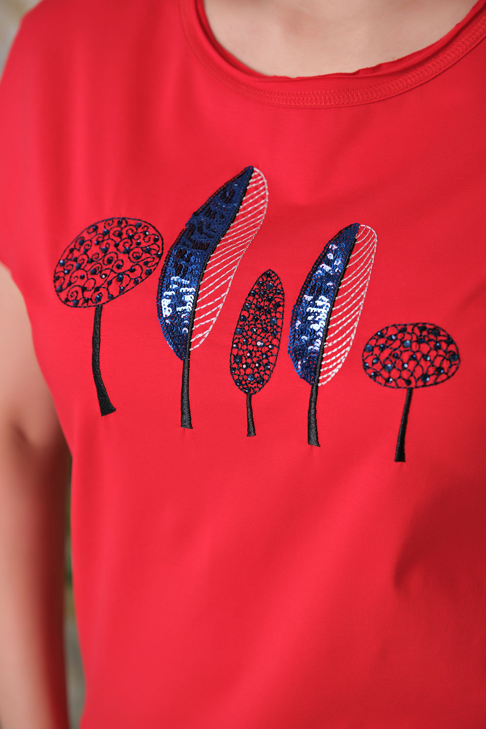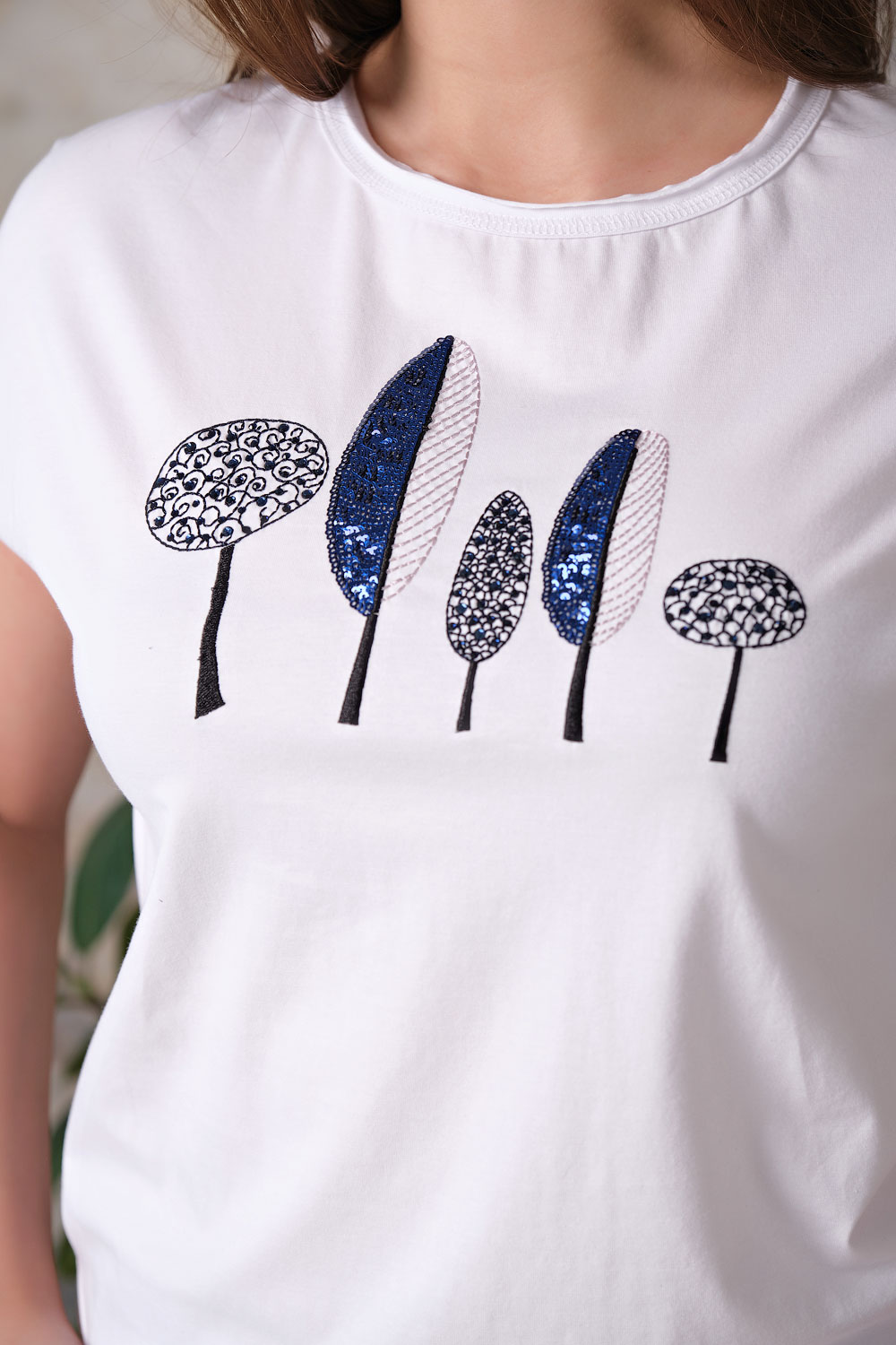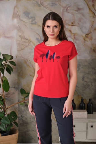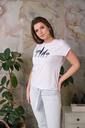Ткань из натуральных материалов обеспечит комфорт и прохладу жарким летом. Круглый вырез горловины создает женственный образ. Короткие цельнокроенные рукава делают модель более женственной. Полуприлегающий покрой подчеркивает изящный силуэт. Футболка украшена вышивкой и пайетками. Данная модель будет хорошо сочетаться с брюками.