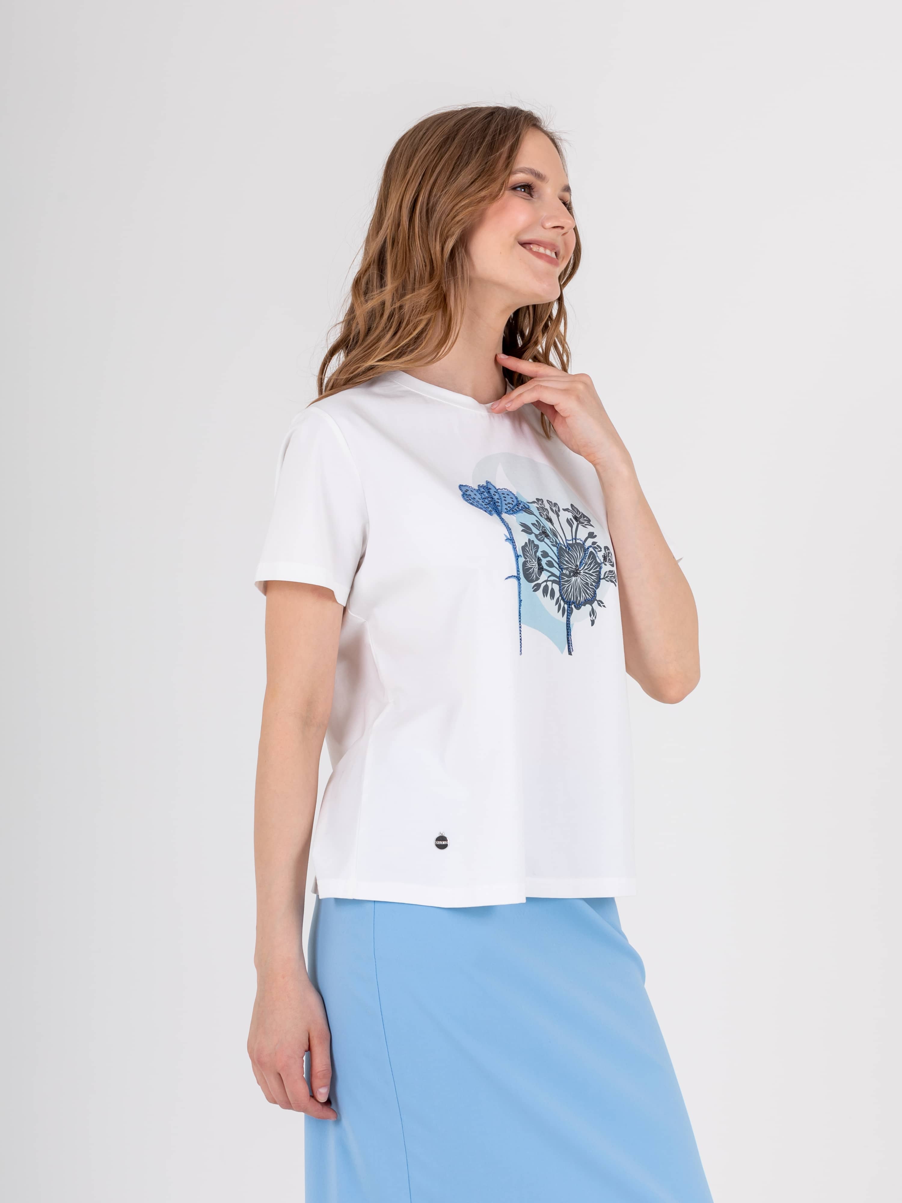 Футболка средней длины прямого силуэта из легкого хлопка с добавлением спандекса. По переду выполнен нежный растительный принт с вышивкой. Укороченные втачные рукава. Круглый вырез горловины.