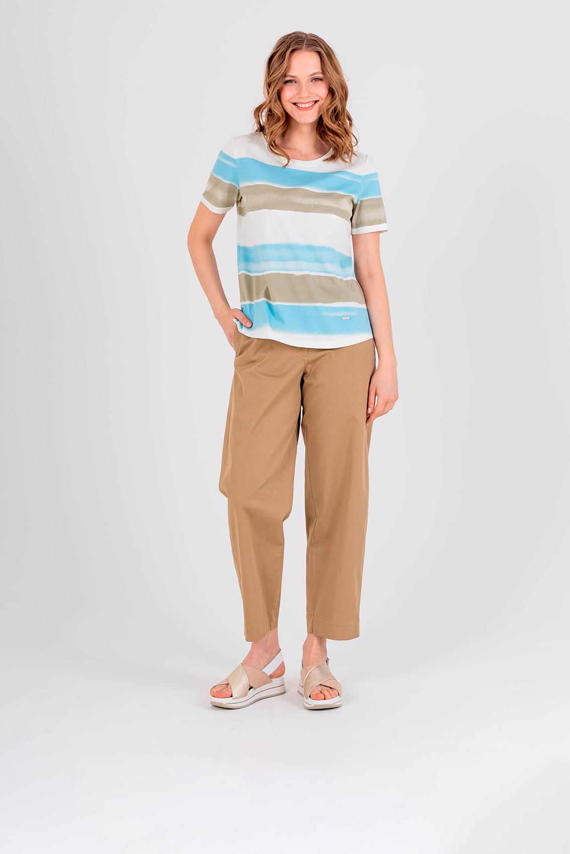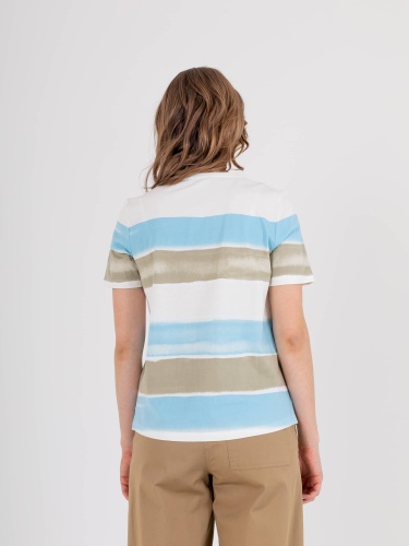 Футболка средней длины прямого силуэта из легкого 100% хлопка с разрезами в боковых швах, дизайнерская особенность модели – нежный принт в полоску. Укороченные втачные рукава. Круглый вырез горловины.