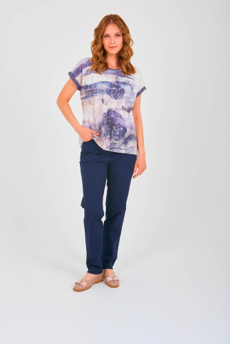 Двухслойная футболка средней длины прямого силуэта из полиэстера с добавлением мягкой вискозы, дизайнерская особенность модели – растительный принт и ажурный трикотаж. Короткие цельнокроеные рукава с манжетами. Круглый вырез горловины.
