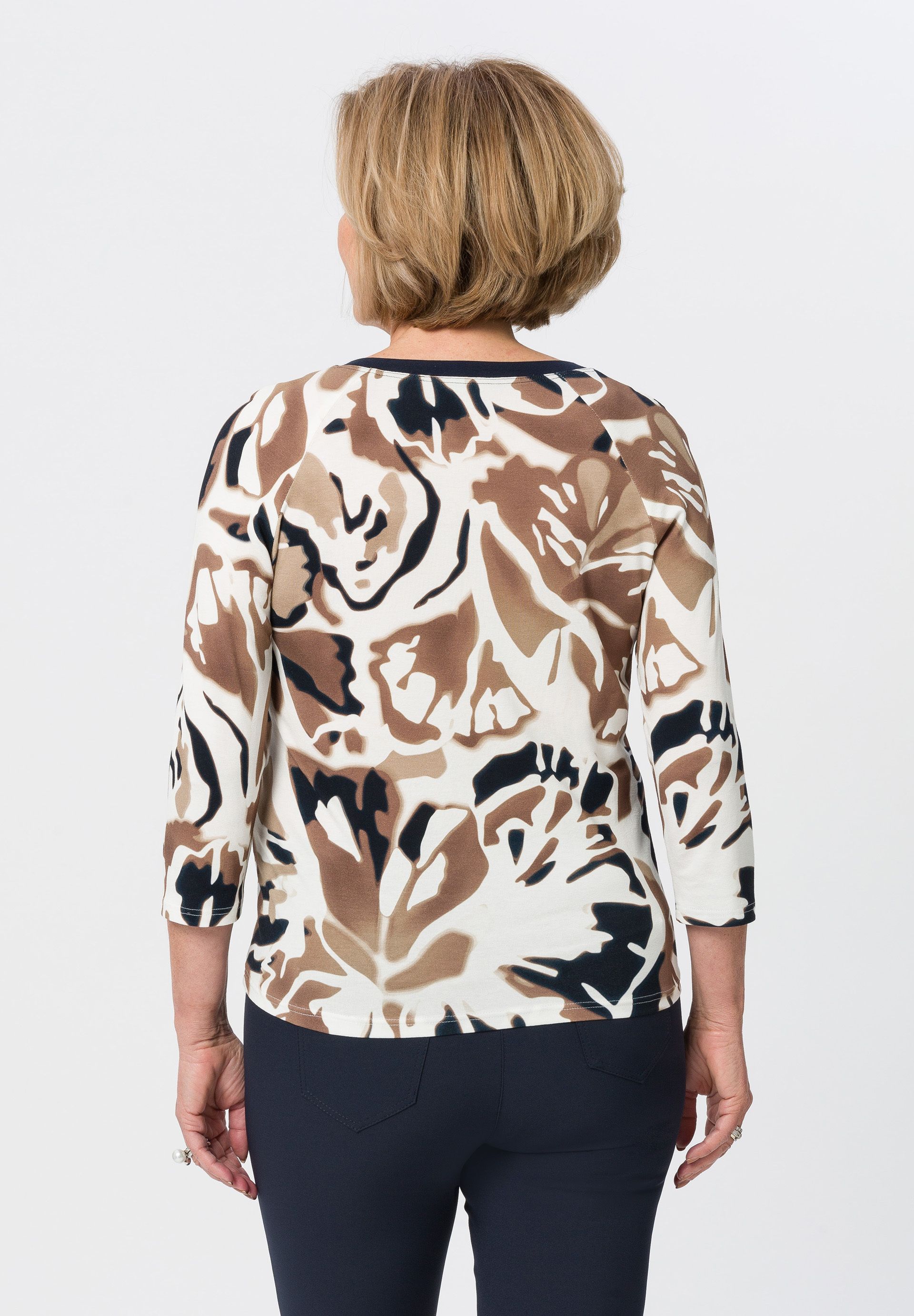 Современная футболка с женственным оттенком. Привлекательный принт и изящно отделанный вырез горловины придают этому стилю непринужденный вид. С модными рукавами реглан длиной 3/4.