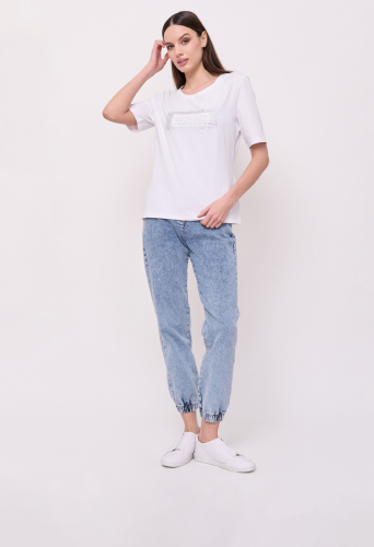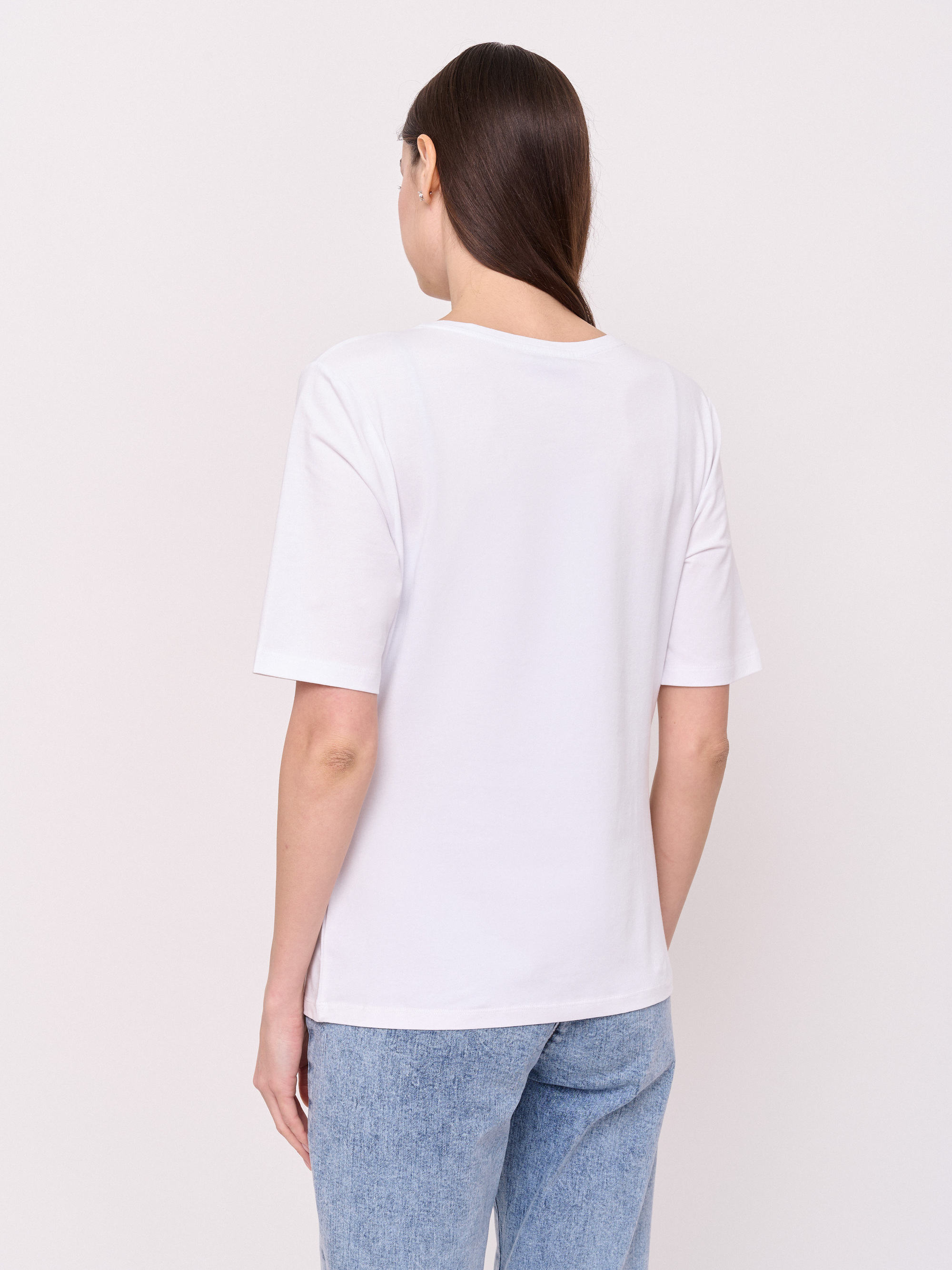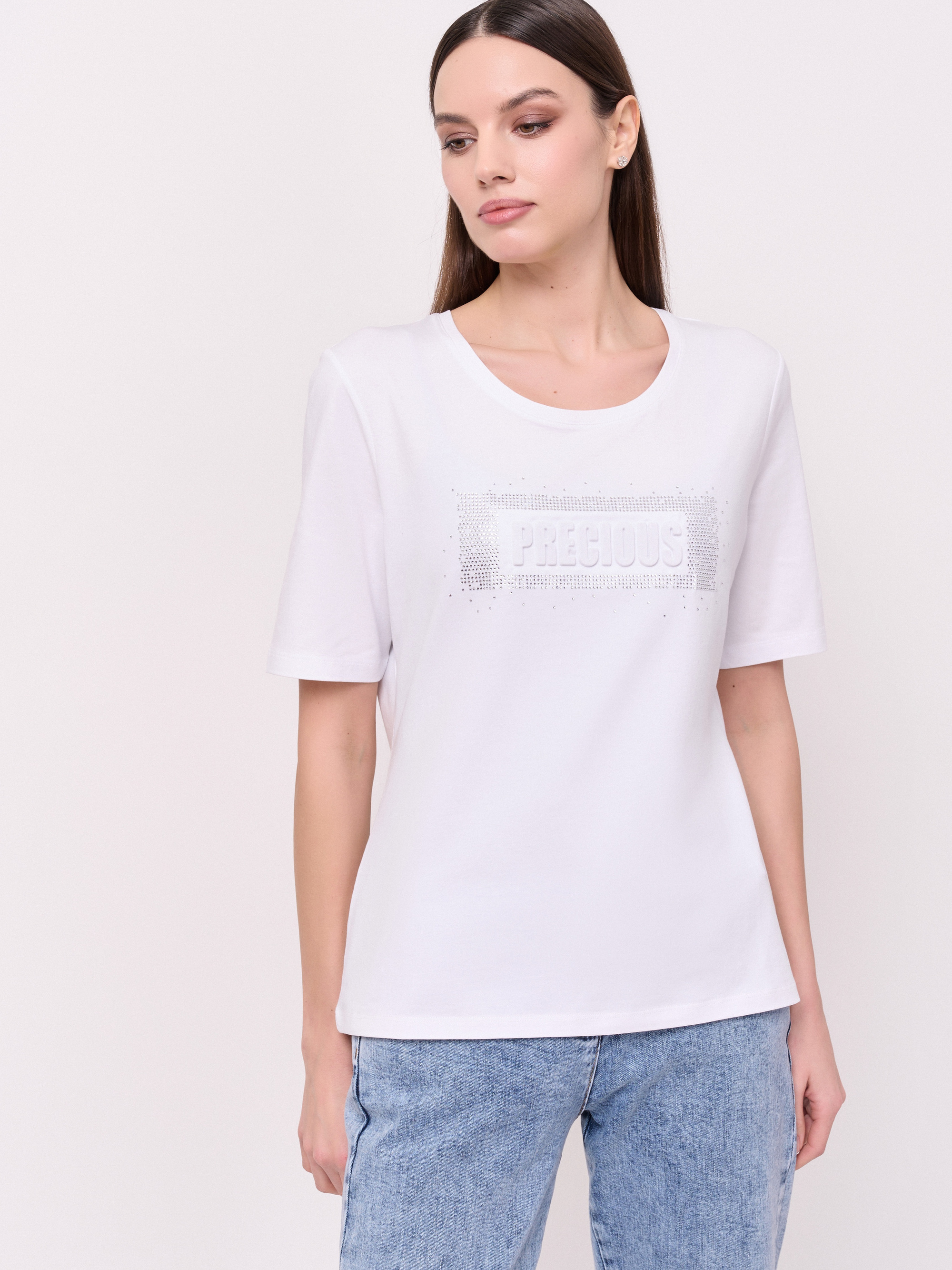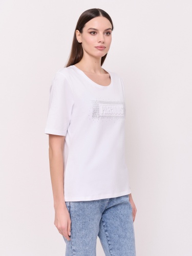 Детали: вырез горловины округлый, покрой полуприталенный, рисунок фактурная надпись, наличие надписи с надписью, стразы. Длина по спинке: 58 см.