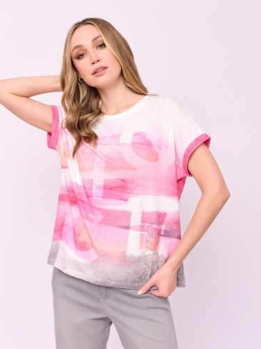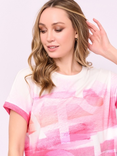 Детали: вырез горловины округлый, покрой прямой, рисунок абстракция, без надписи, стразы. Длина по спинке: 58 см.