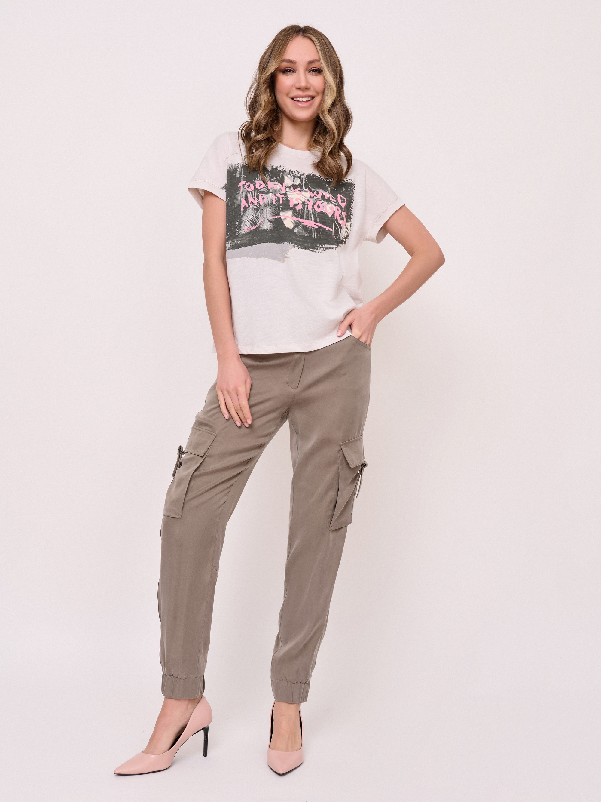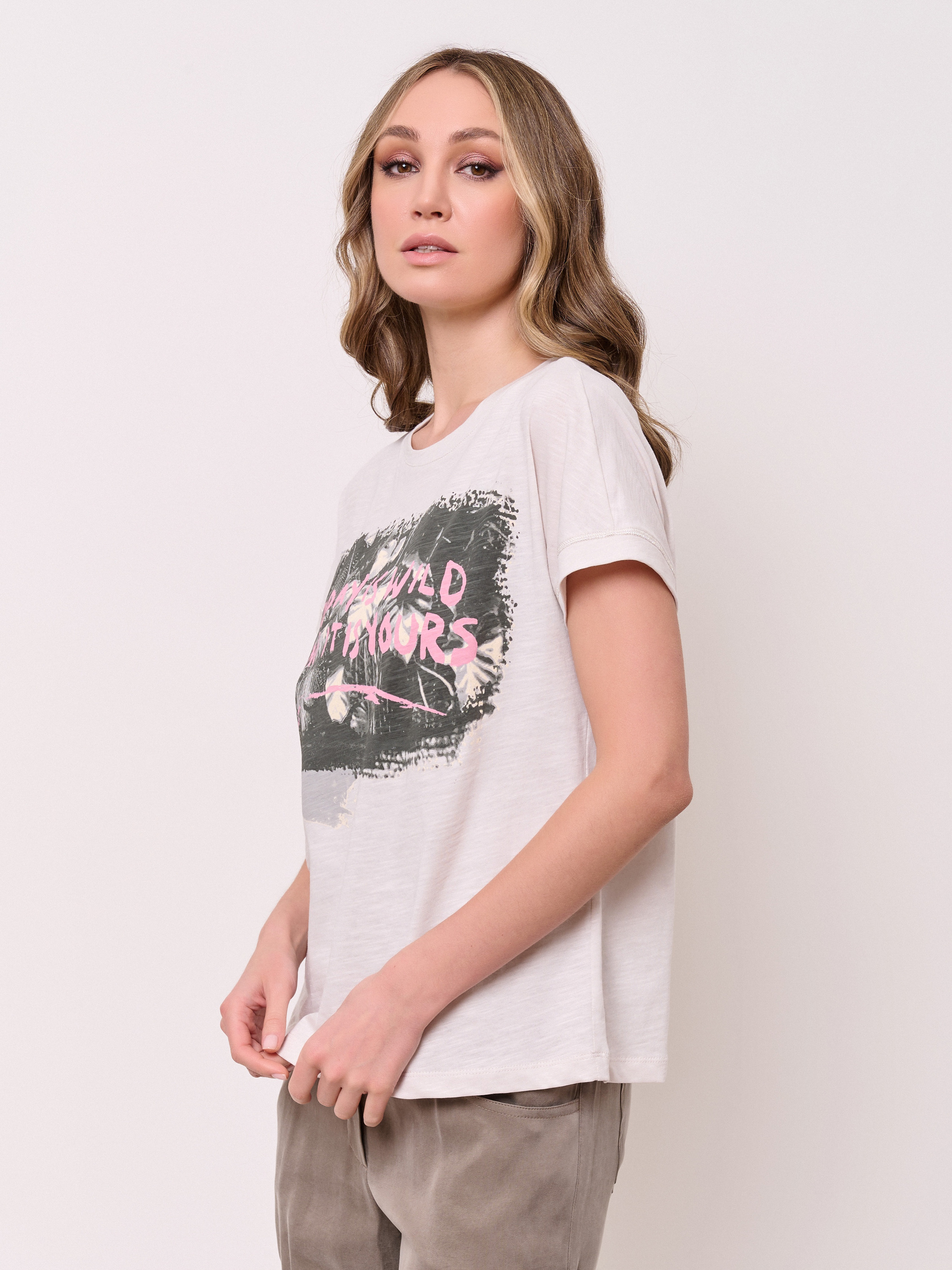 Детали: вырез горловины округлый, покрой прямой, рисунок цветы и растения, наличие надписи с надписью, рукава короткие цельнокроеные. Длина по спинке: 58 см.