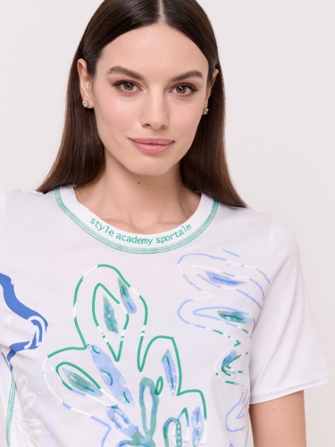 Детали: вырез горловины округлый, покрой полуприталенный, рисунок цветы и растения, наличие надписи с надписью, вышивка бисером, аплликации. Длина по спинке: 59 см.