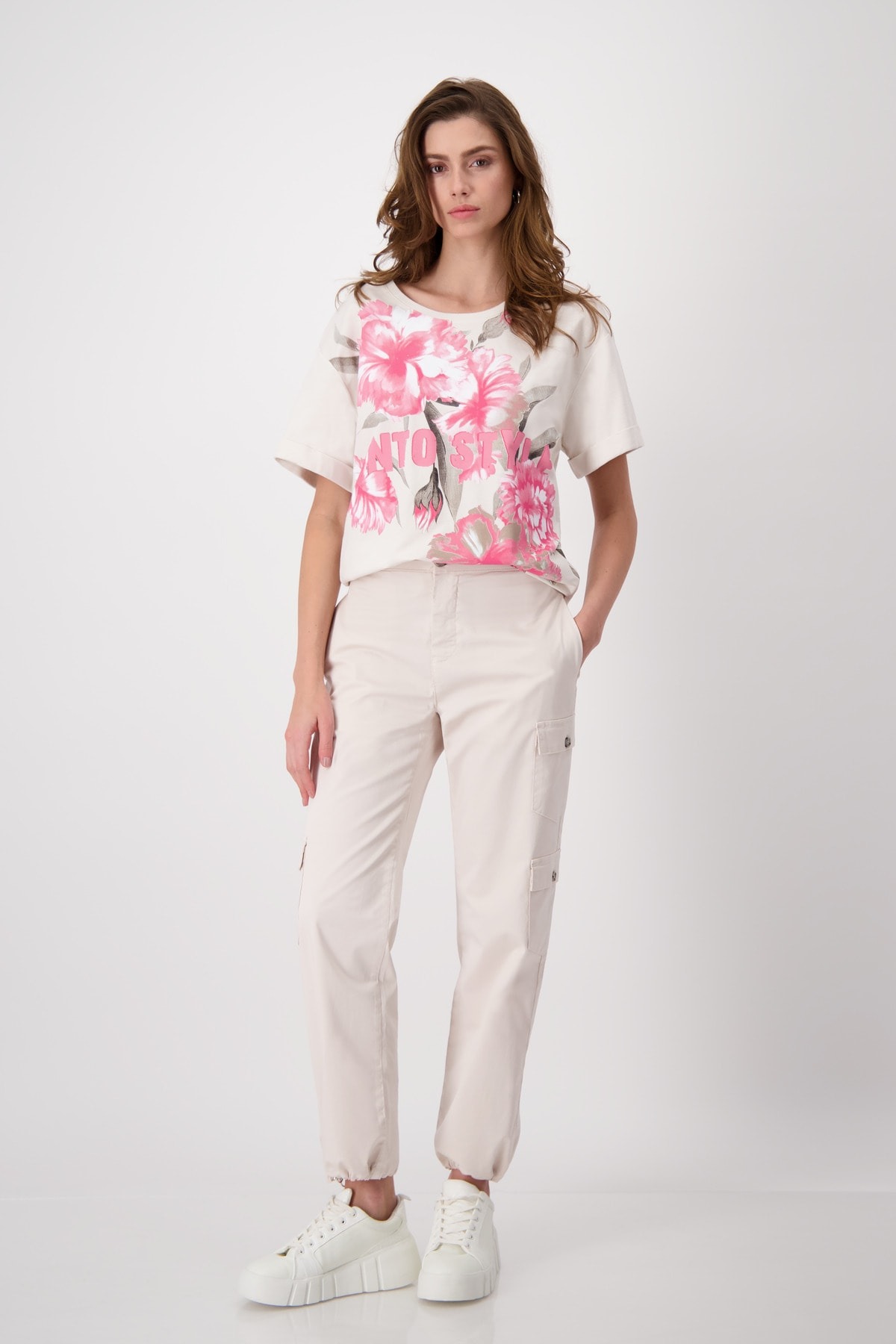 Футболка с короткими рукавами, письменным и цветочным принтом, повседневного кроя. Высококачественная смесь хлопка. Мягкое ощущение. Цветочный узор с надписью. Регулярная посадка. Круглый вырез. Манжеты. Боковые разрезы