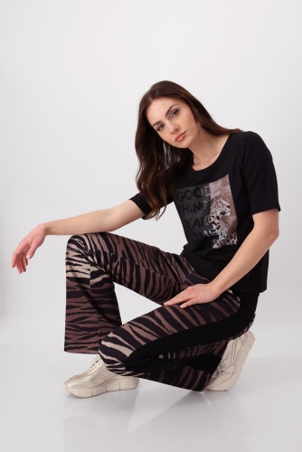 Стильная футболка из высококачественного смесового хлопка, украшенная сверкающими надписями из стразов. Круглый вырез. 1/2 руки. Длина 44 размера 62 см.