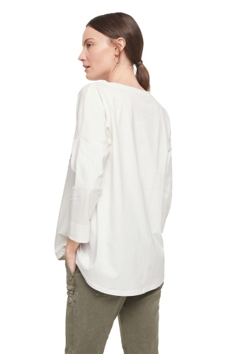 Футболка с принтом. Втачной рукав ¾ со спущенной линией плеча. Кулиска по низу изделия. Материал из смесового хлопка приятен к телу и комфортен в ношении.
