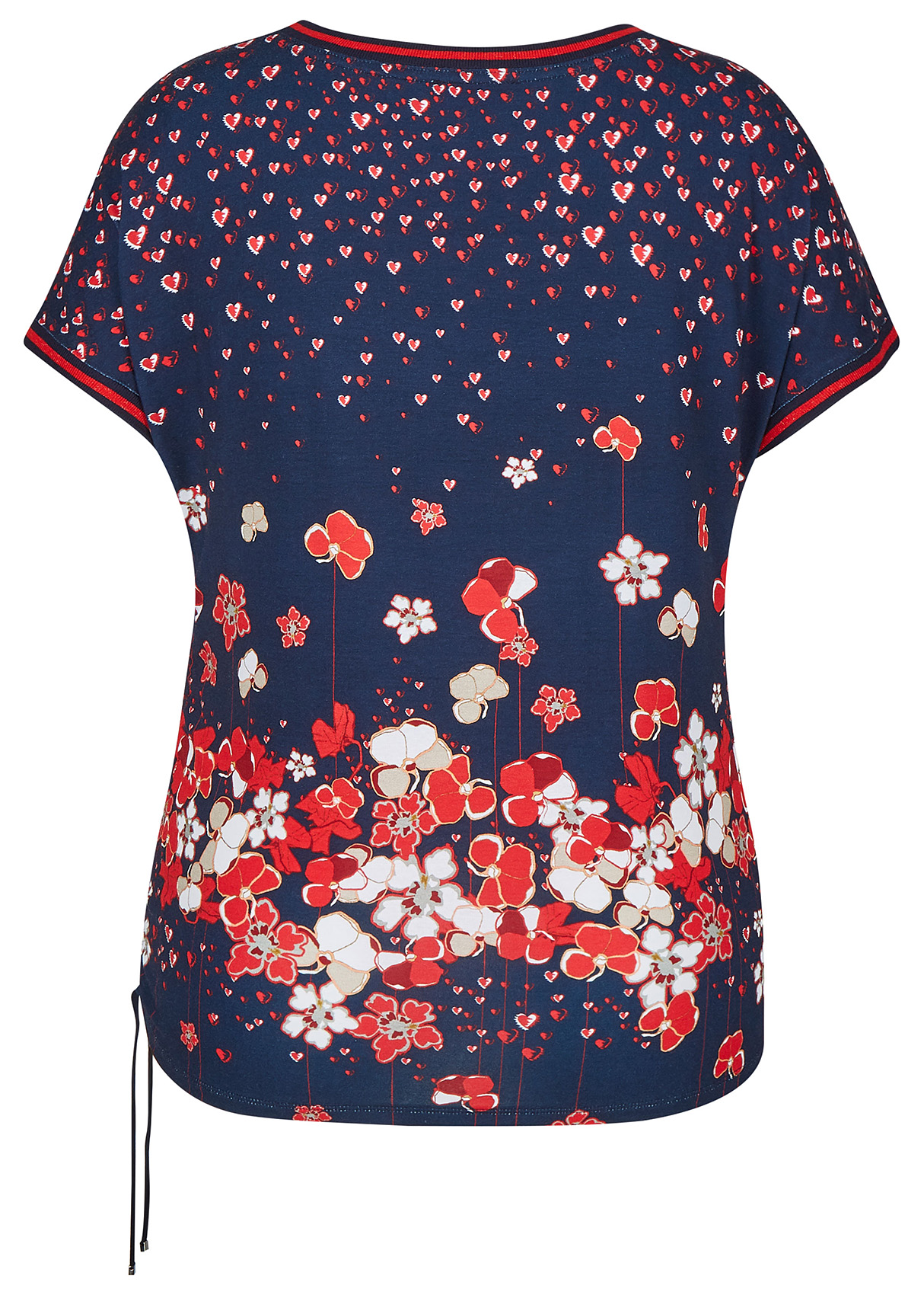 Эта футболка привлекает внимание контрастным принтом. Полуприлегающий силуэт. Круглый вырез горловины и короткие цельнокроеные рукава обработаны контрастной обтачкой в полоску. Еще одна особенность дизайна - кулиска в левом боковом шве, что позволяет регулировать длину и создать красивые драпировки. Приятный к телу материал из вискозной смеси обеспечивает комфорт в ношении.