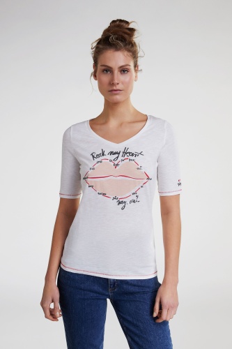Футболка слегка приталенного силуэта. V-образный вырез горловины, рукава 1/2. Контрастная отстрочка на рукавах и по низу изделия. Принт на груди. Вышивка пайетками придает гламурный блеск. Хлопковый материал приятен к телу и обеспечивает комфорт. Эта футболка - замечательная основа для демократичного образа.