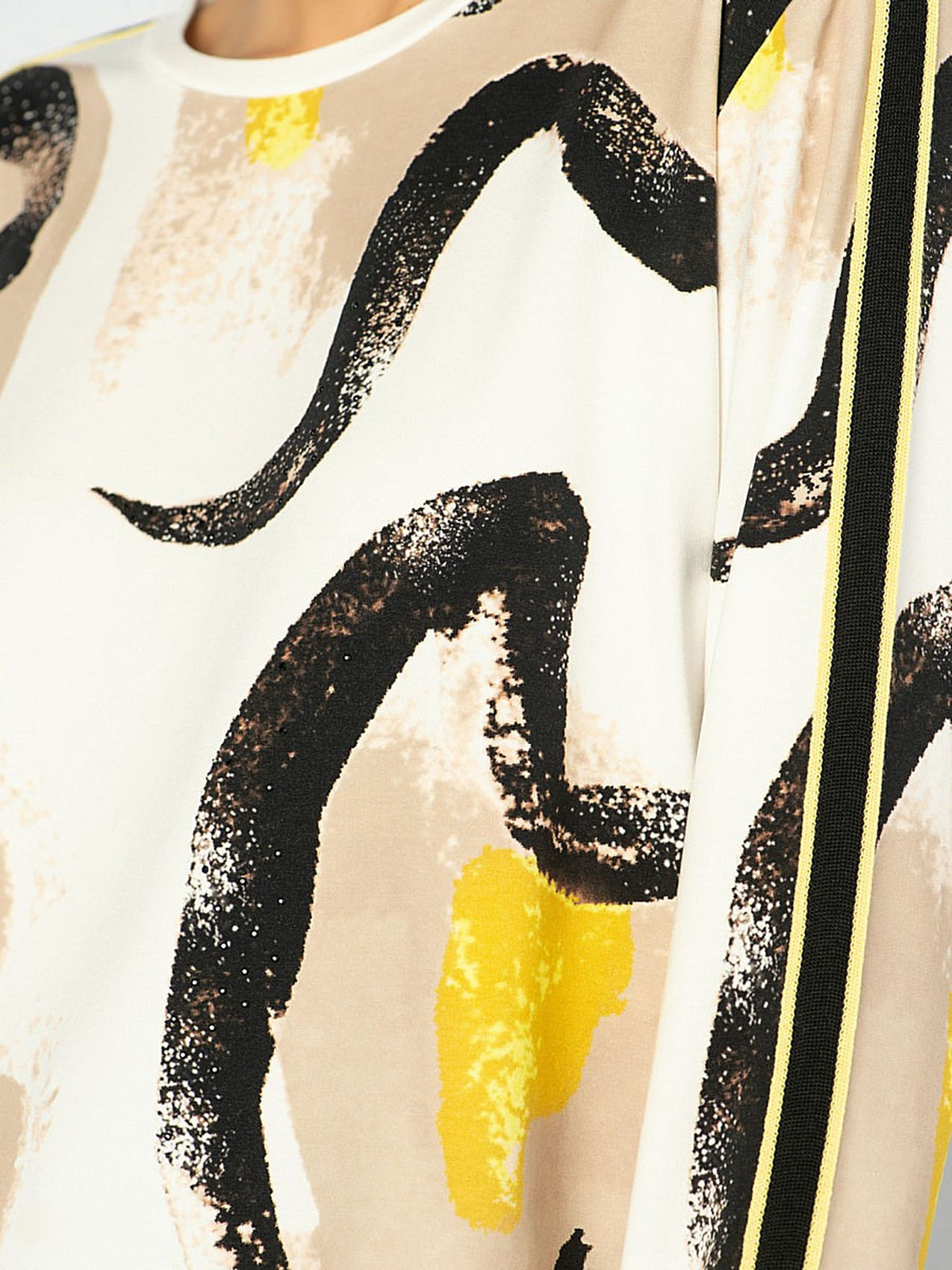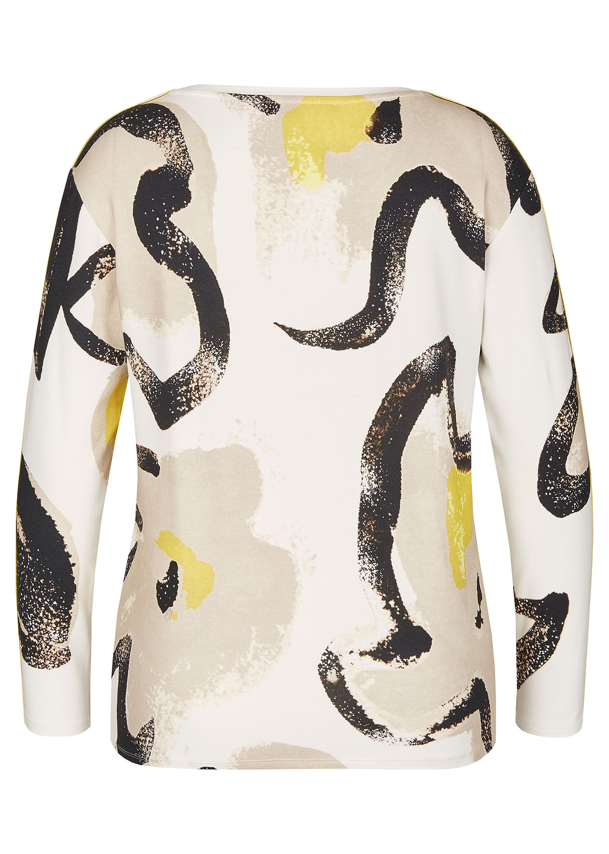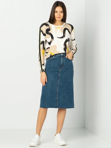 Футболка-лонгслив. Трендовый абстрактный принт. Слегка приталенный силуэт. Декоративная лента на плечах и рукавах. Материал из смеси хлопка, модала и эластана обеспечивает комфорт. Длина изделия по спинке: 65 см.