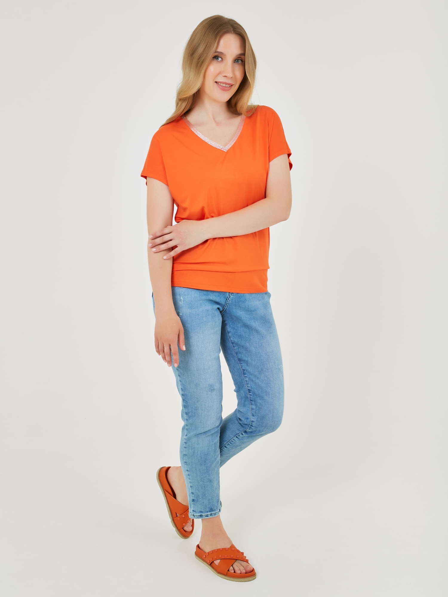 Яркая футболка с V-образным блестящим вырезом и свободным кроем. Коллекция Весна-Лето 2025. Капсула "Санторини". Параметры модели: 89-70-92, рост 167, размер 44-46