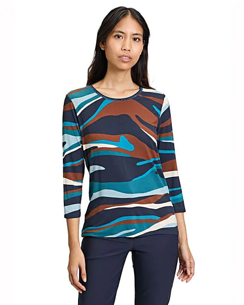 Кофта сочетает в себе яркий стиль и максимальный комфорт. Её рукава три четверти добавляют лёгкости и современности, а абстрактный узор из темно-синих, бирюзовых, коричневых и белых волнистых полос создаёт неповторимый визуальный эффект. Такая модель станет прекрасным дополнением вашего гардероба, позволяя создавать интересные и оригинальные образы, которые обязательно обратят на вас внимание и подчеркнут вашу индивидуальность.
