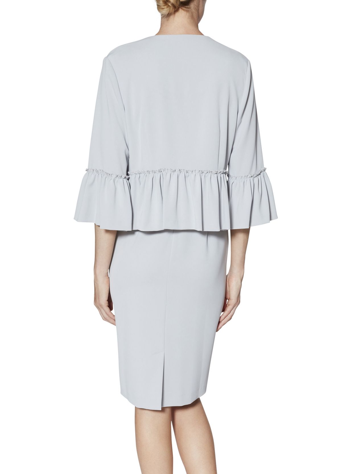 Приталенное платье сочетается с красиво скроенным жакетом из той же ткани. Жакет присборен на рукаве и на талии для создания эффекта баски. Платье полностью на подкладке и застегивается на потайную молнию сзади. Куртка застегивается на невидимые крючки спереди.