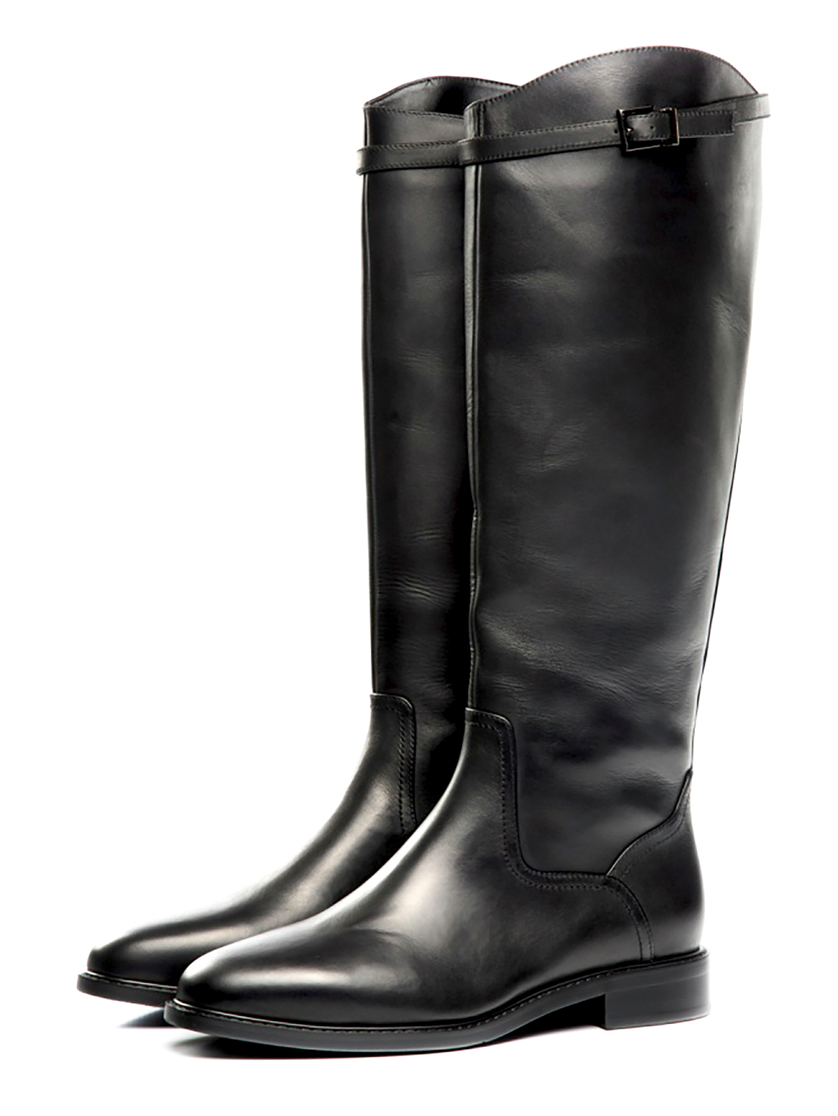 Женские кожаные сапоги жокейского стиля на подкладке из байки. Декорированы кожаным ремешком с пряжкой. Молния 3/4 с внутренней стороны.